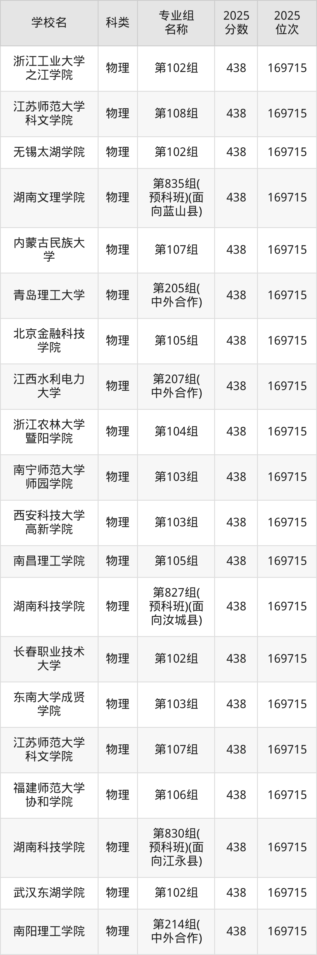 2025年重庆物理类本科线为425分,438分能上的本科大学共计105所,其中公办大学录取位次排名最低的是江西师范大学(425分),其2025最低位次为103219名。