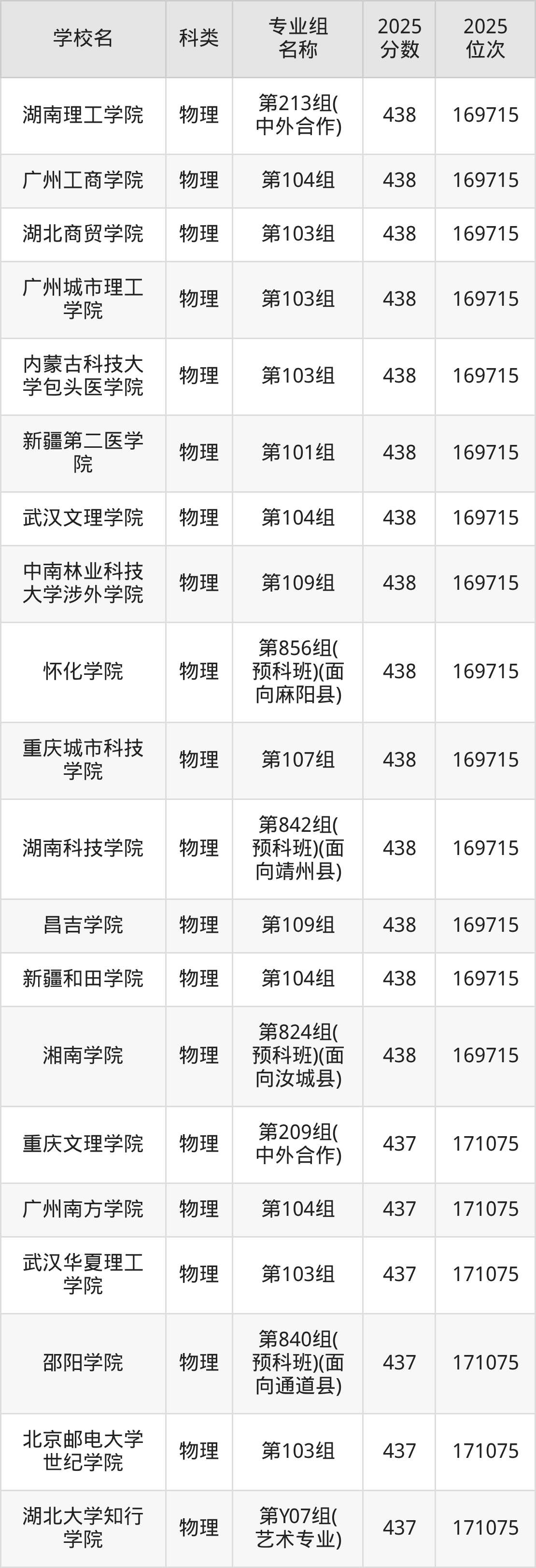 2025年湖南物理类本科线为405分,438分能上的本科大学共计235所,其中最低分公办院校为邵阳学院(第829组(预科班)(面向慈利县)406分),对应最低位次为210303名。因此想上公办本科的考生省排名位次至少要在210303名以内。
