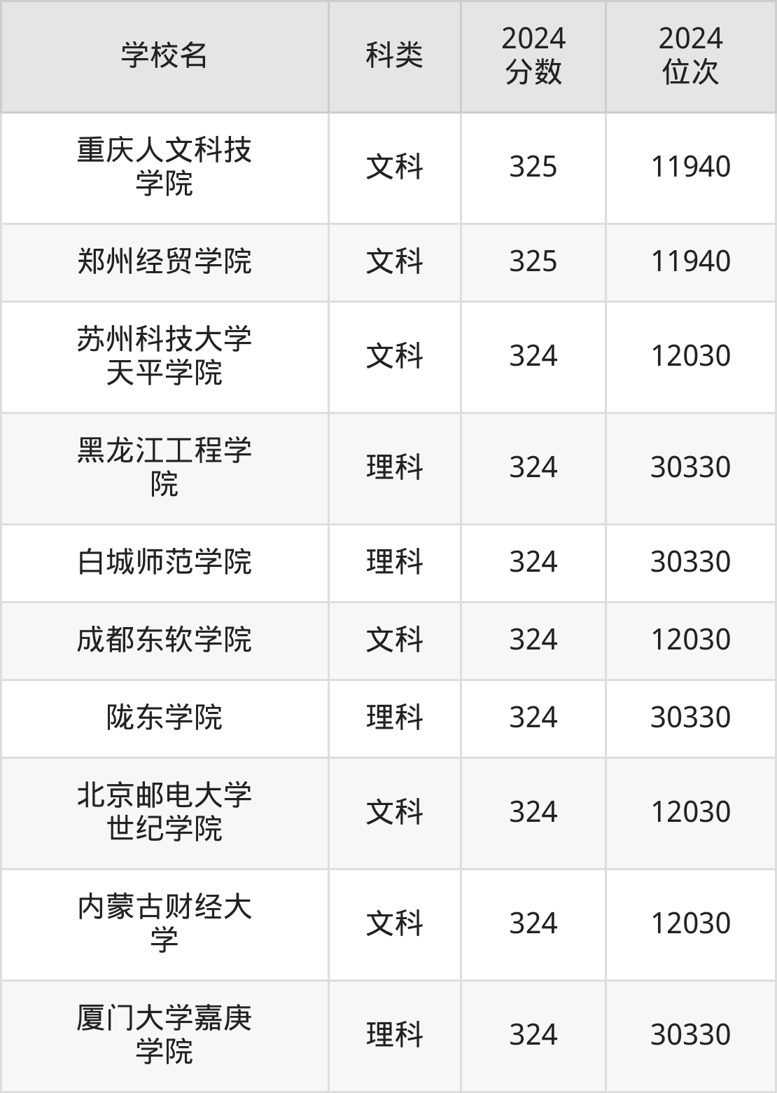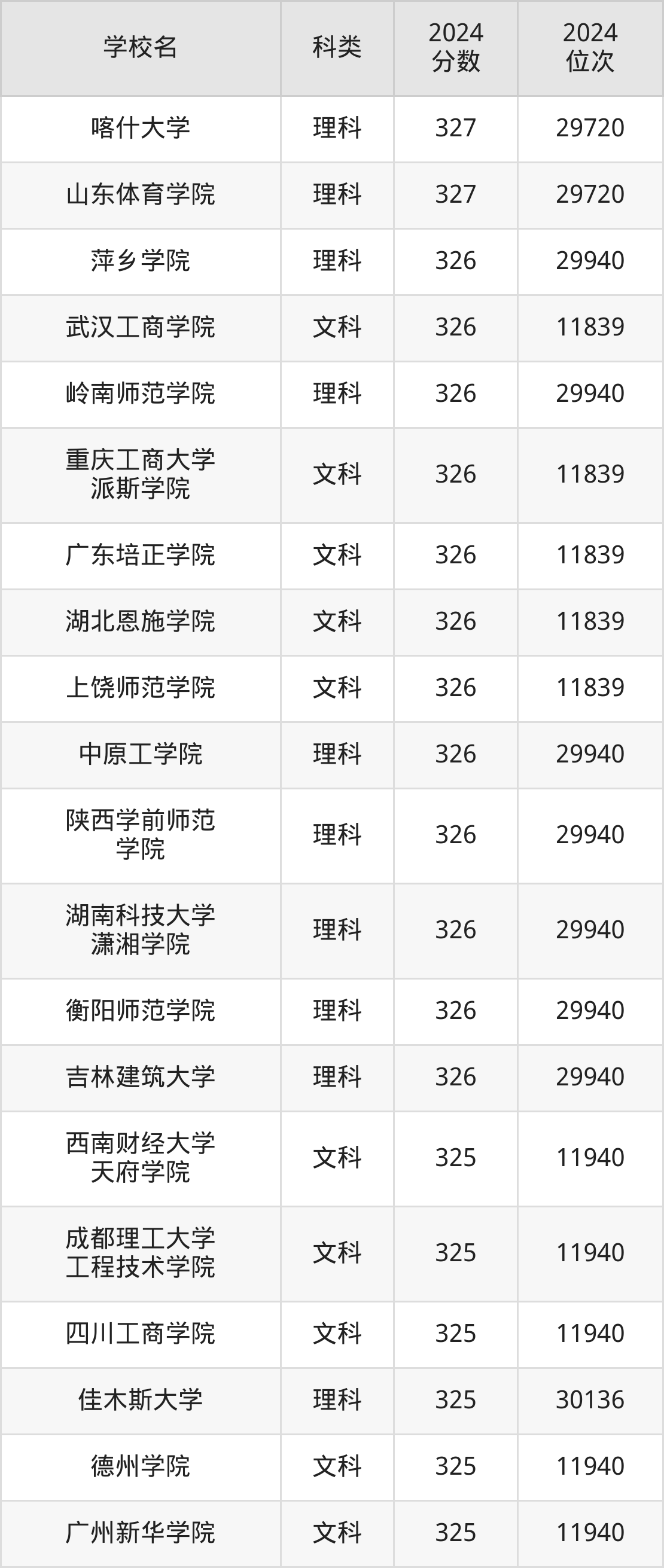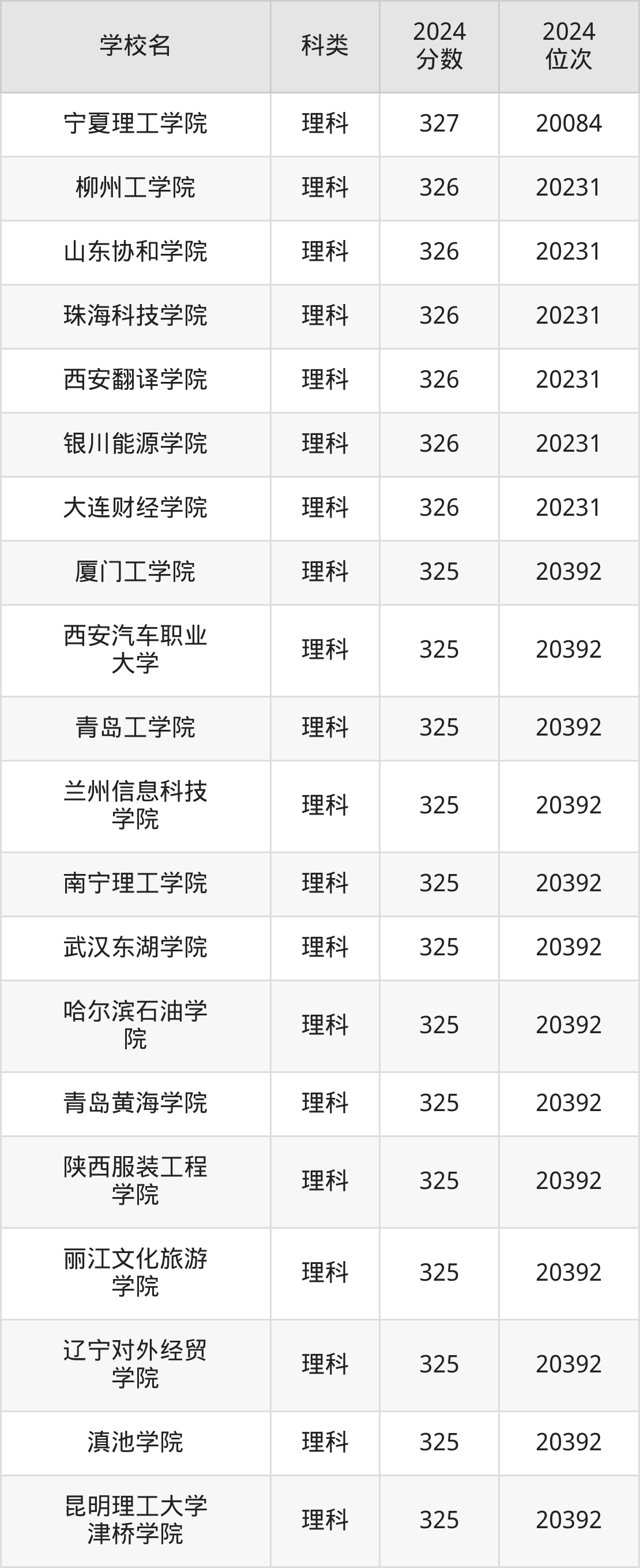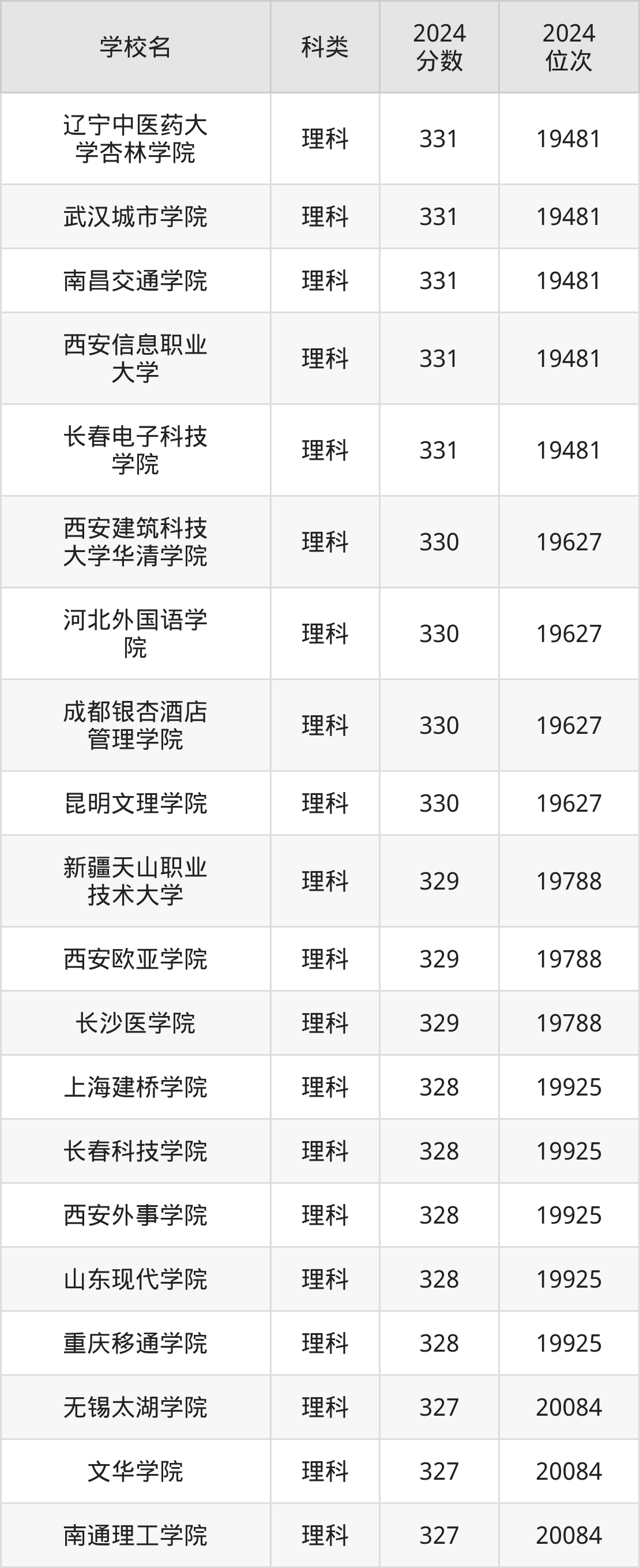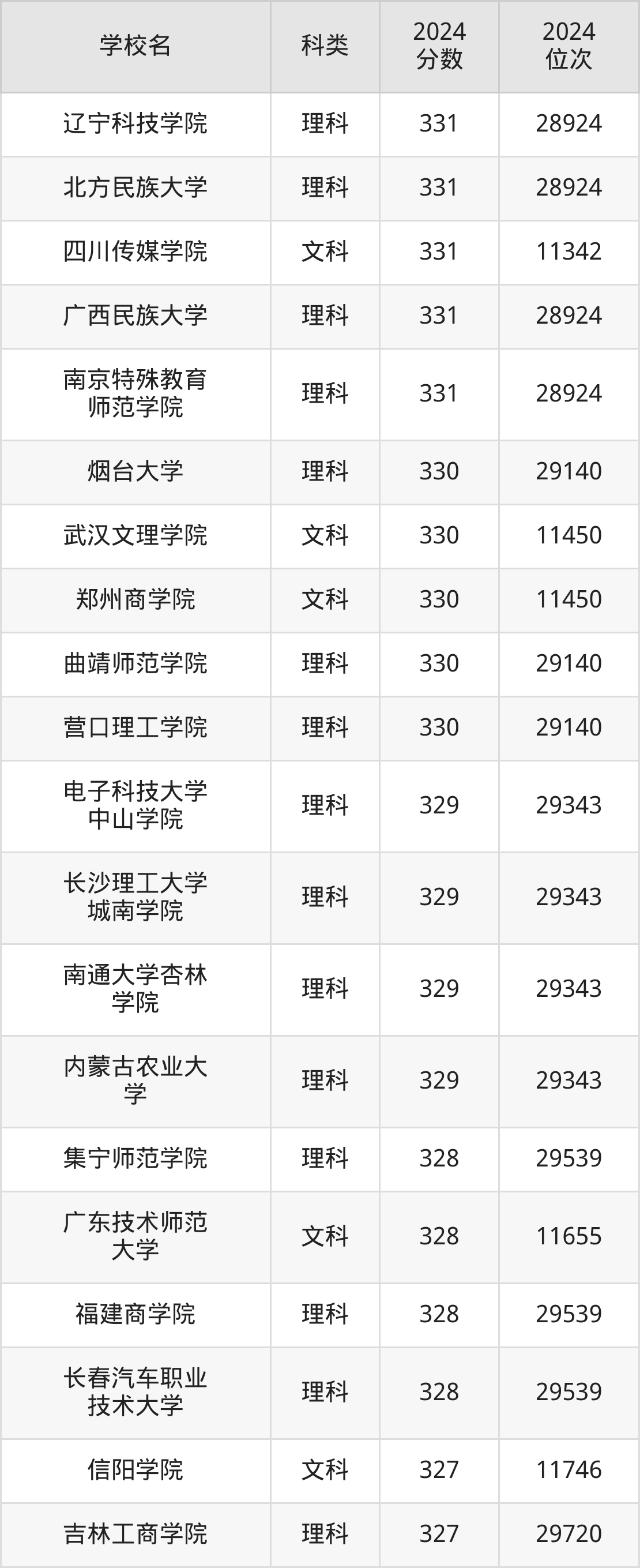 2024年青海理科二本线为325分,331分能上的二本大学共计44所,其中民办大学录取位次排名最低的是辽宁对外经贸学院(325分),其2024最低位次为20392名。
