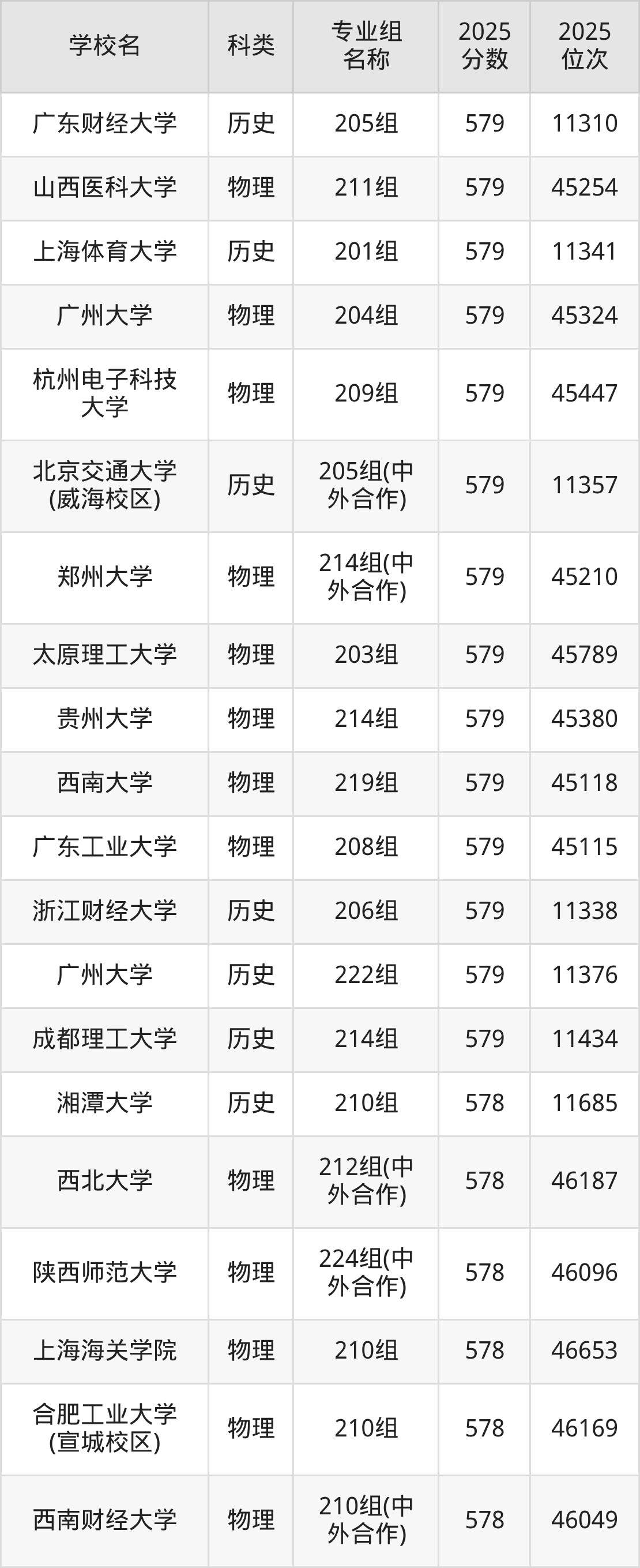 2025年贵州历史类本科线为458分,579分能上的本科大学共计825所,其中公办大学录取位次排名最低的是贵州财经大学(462分,位次37303名),即代表考生省排名位次在37303名及以内就可以报考公办本科。