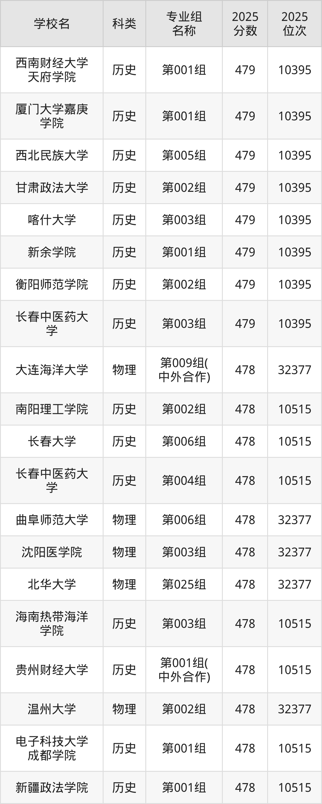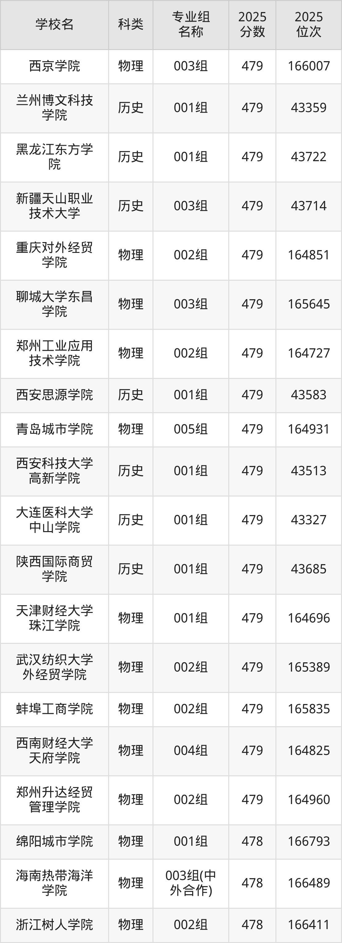 以吉林物理类为例,479分能上的二本大学有重庆外语外事学院(位次排名61283名)、商丘师范学院(位次排名37904名)、西安翻译学院(位次排名55692名)。