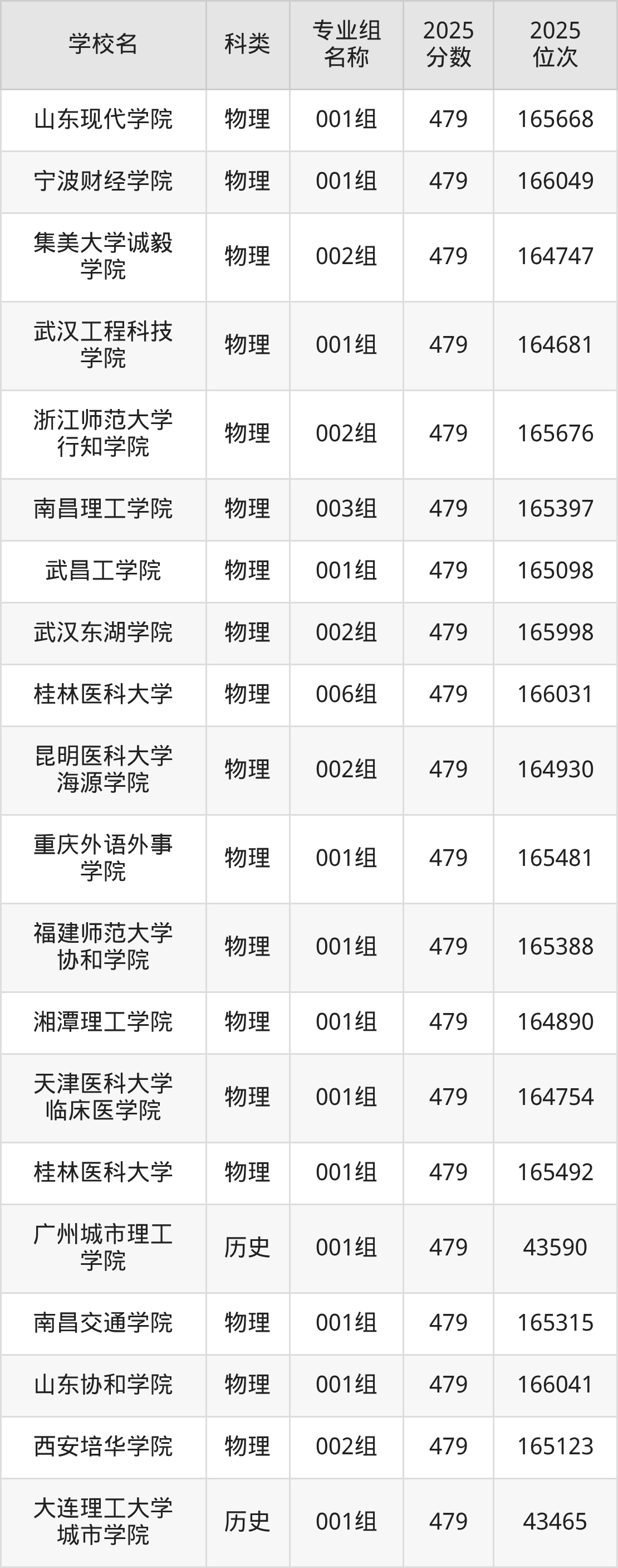 2025年安徽物理类本科线为461分,479分能上的二本大学共计157所,其中公办大学录取位次排名最低的是桂林旅游学院(001组(中外合作)467分,位次182800名),即代表考生省排名位次在182800名及以内就可以报考公办本科。