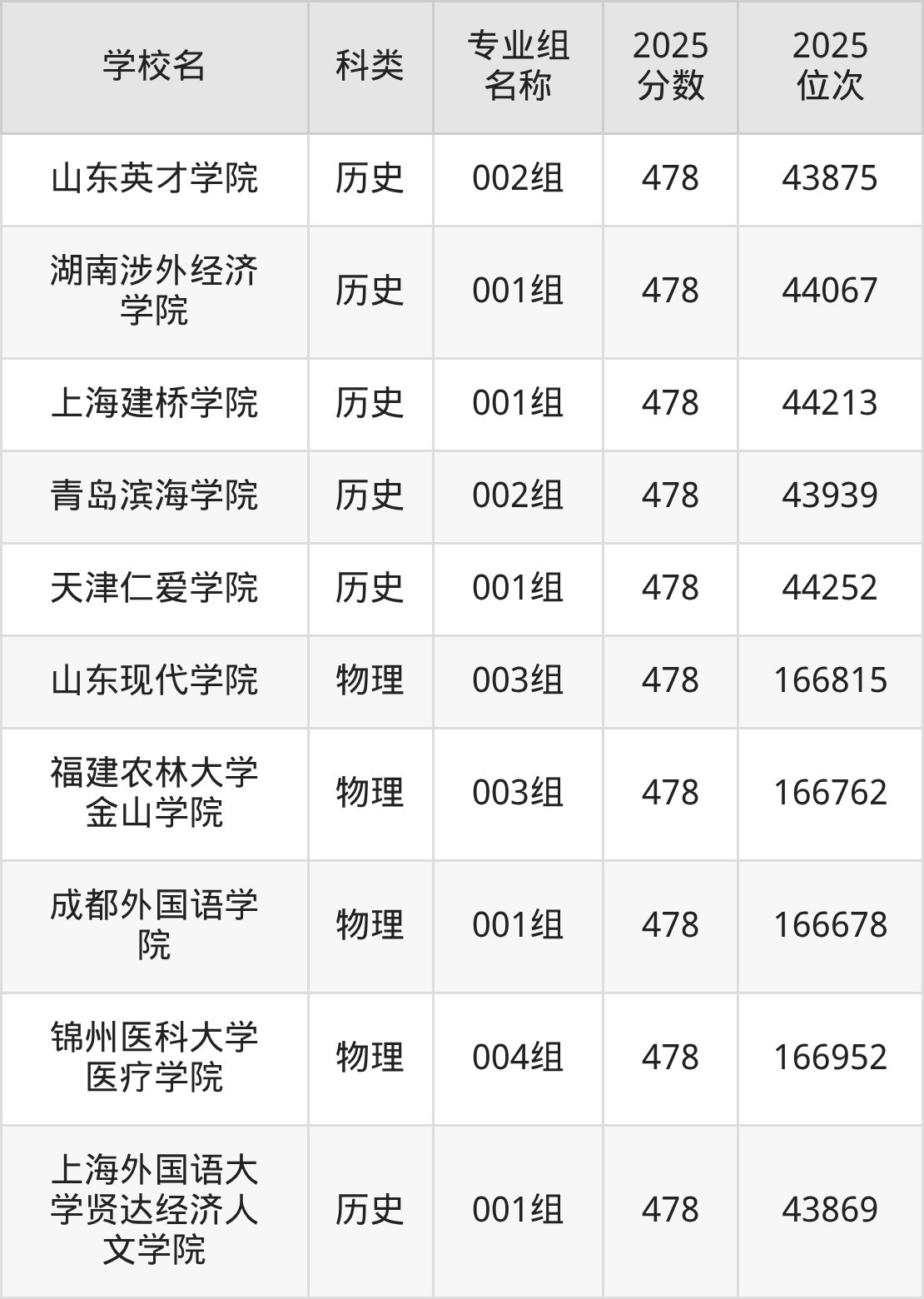 而位次最低的民办院校有陕西服装工程学院(第302组)、西安欧亚学院(第302组)、长春建筑学院(第301组)、南昌理工学院(第302组),分数为419分,对应最低位次排名为120285名。