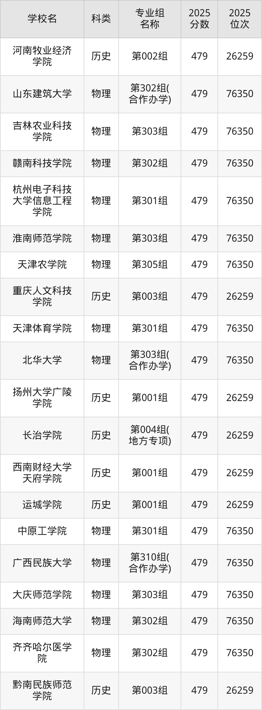 除上述院校外,479分可上的公办二本大学还有周口师范学院(第301组464分,位次88112名)、黑河学院(第301组452分,位次97419名)。