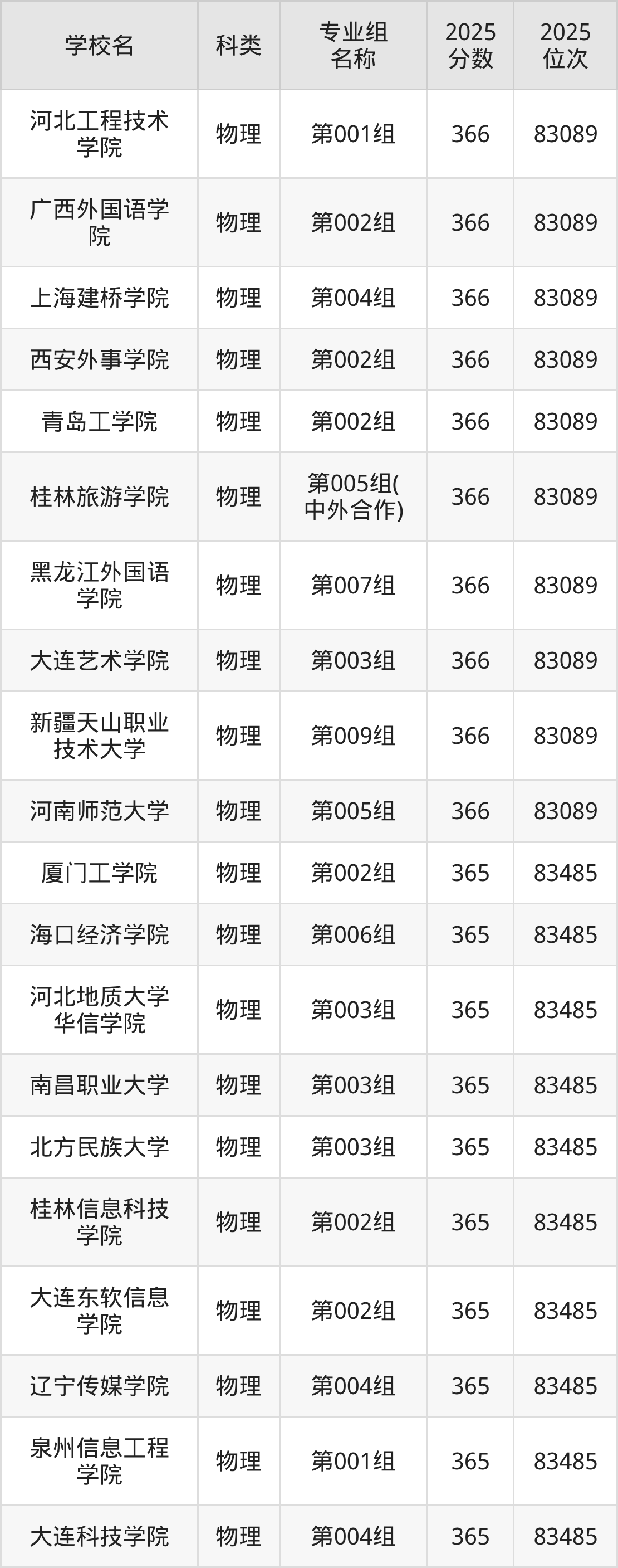 以黑龙江物理类为例,366分能上的本科大学有上海建桥学院(位次排名83089名)、哈尔滨信息工程学院(位次排名84950名)、天津仁爱学院(位次排名85313名)。