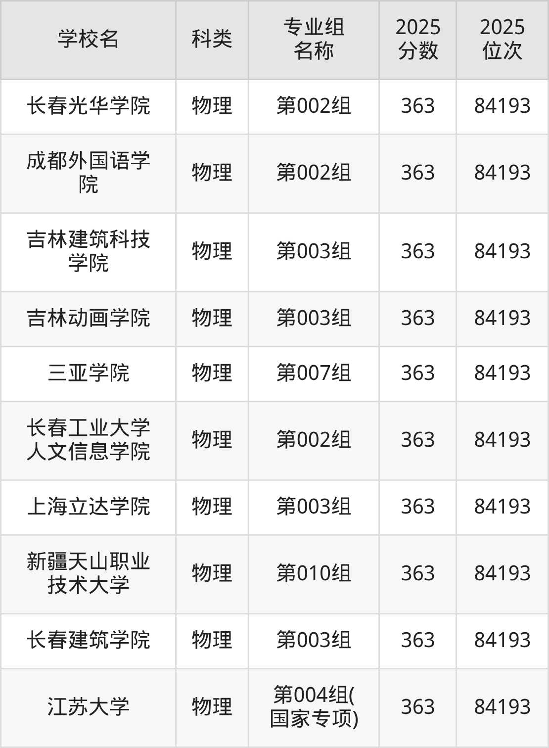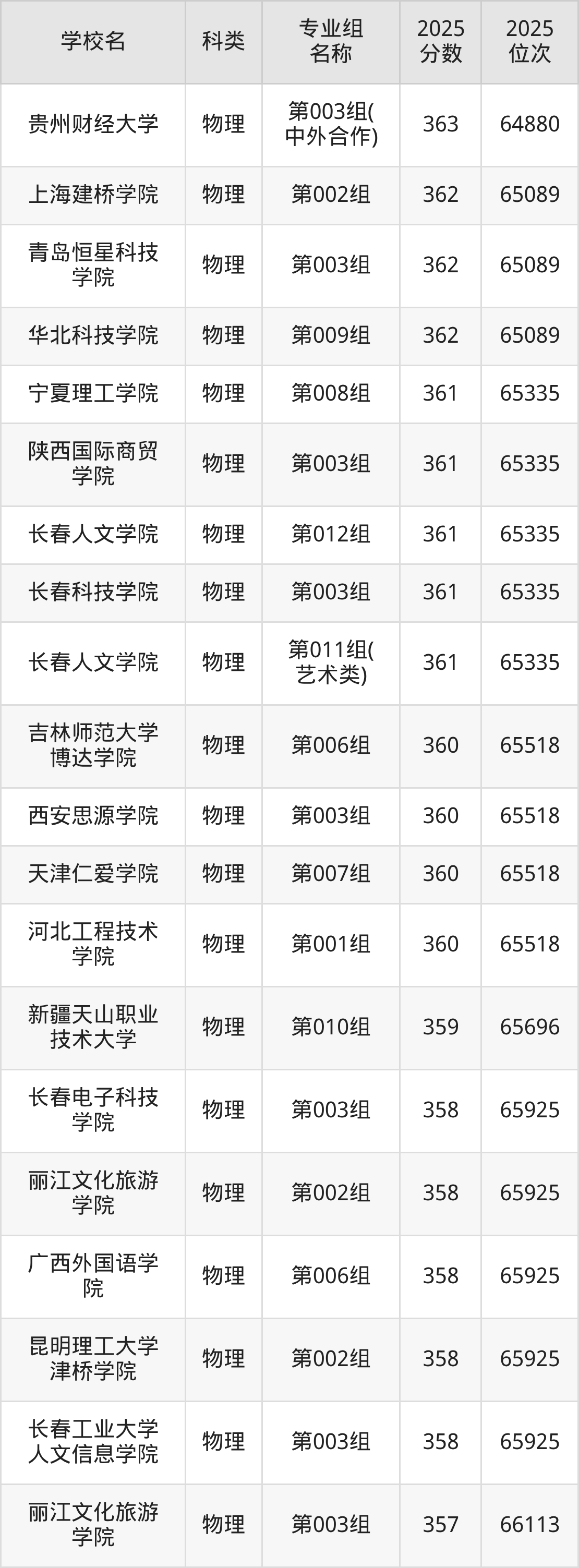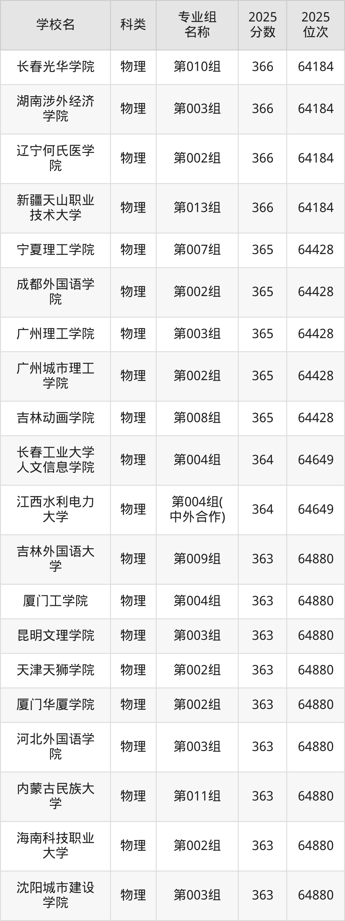 2025年吉林物理类本科线为340分,366分能上的本科大学共计71所,其中公办大学录取位次排名最低的是聊城大学(第004组(中外合作)340分,位次69405名),即代表考生省排名位次在69405名及以内就可以报考公办本科。