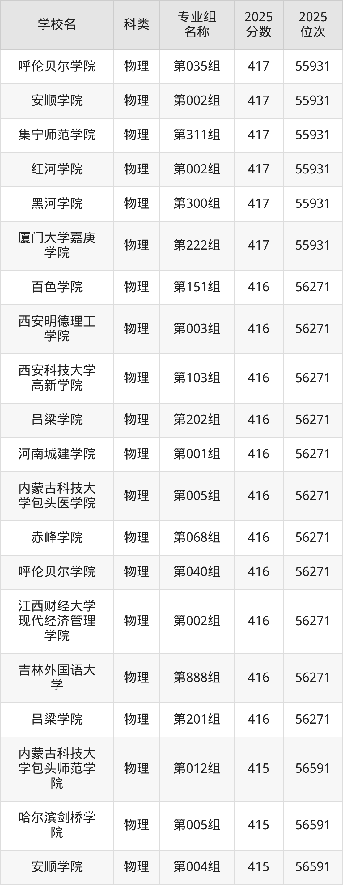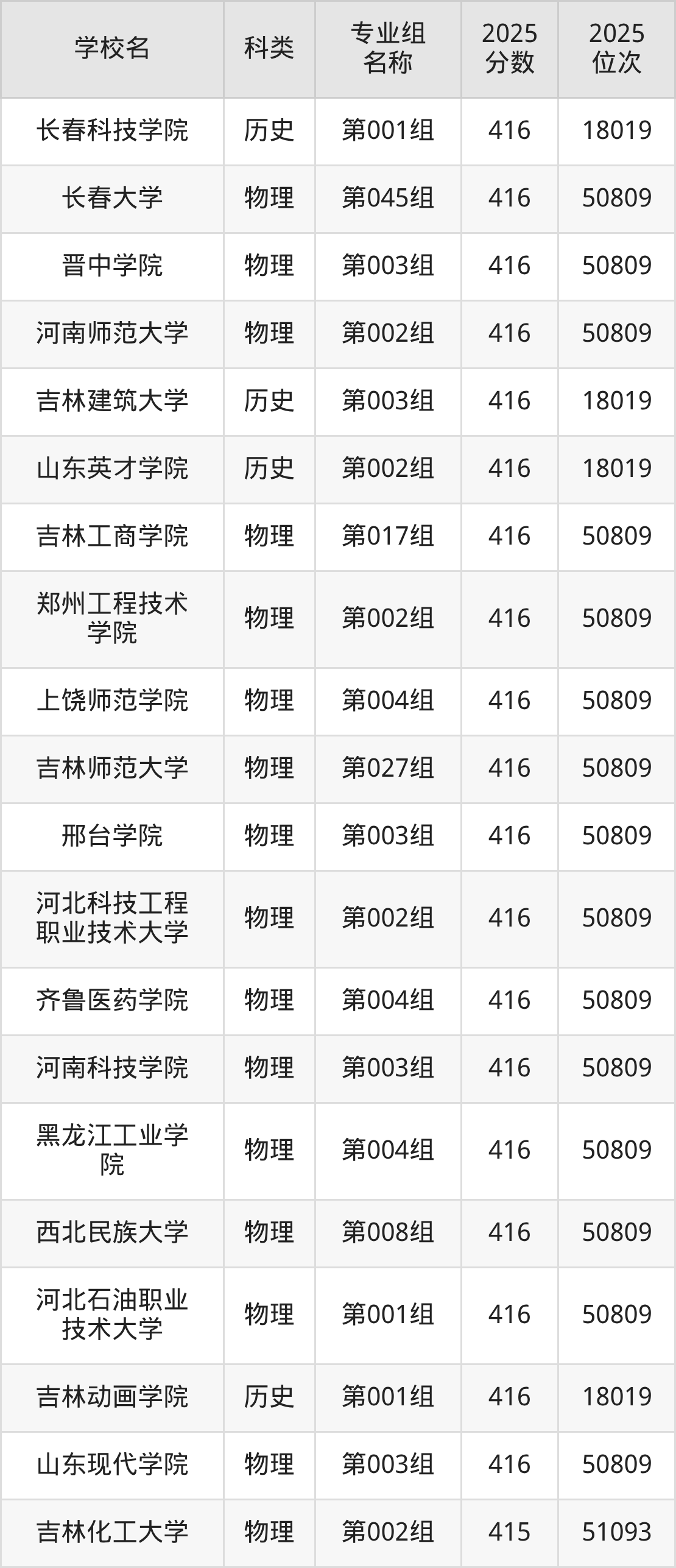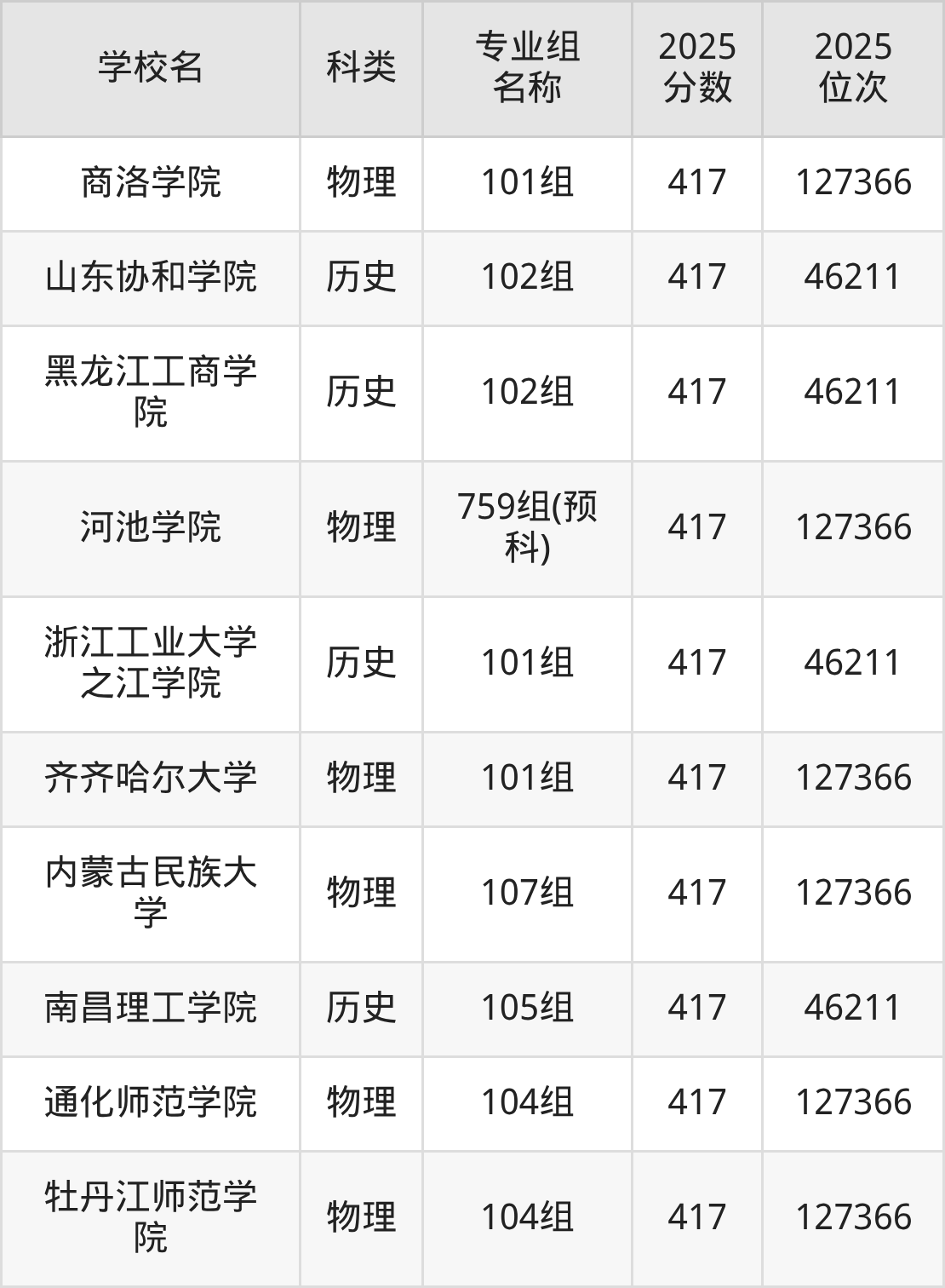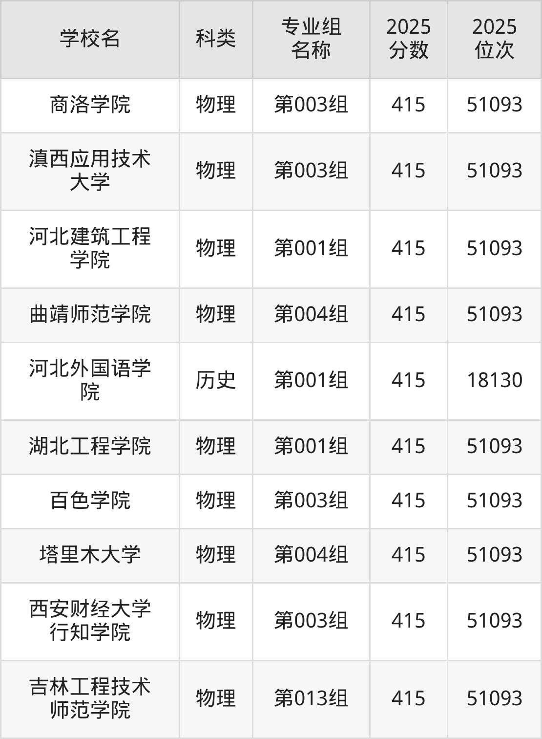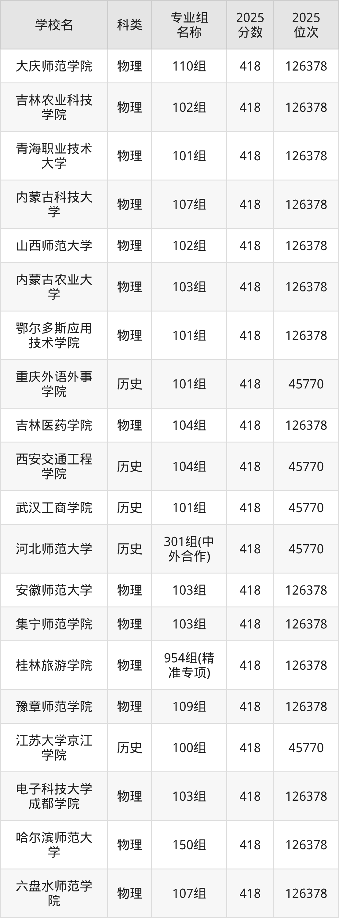 除上述院校外,418分可上的公办本科大学还有吕梁学院(第206组415分,位次56591名)、塔里木大学(第002组410分,位次58187名)。