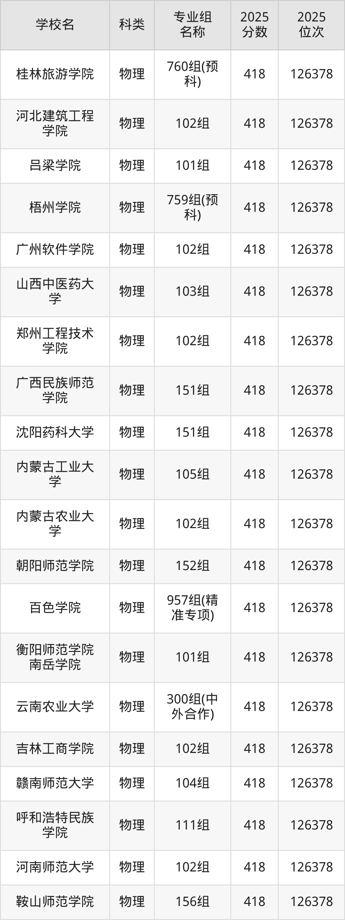 2025年广西物理类本科线为370分,418分能上的本科大学共计425所,其中公办大学录取位次排名最低的是桂林医科大学(951组370分),其2025最低位次为174425名。