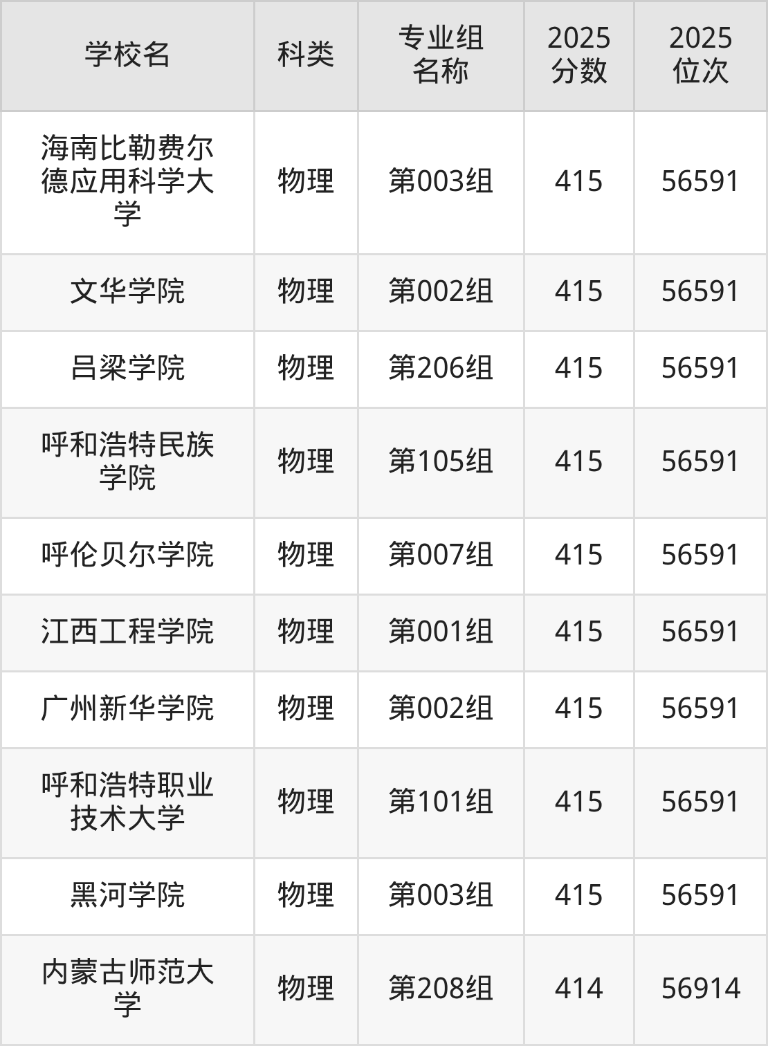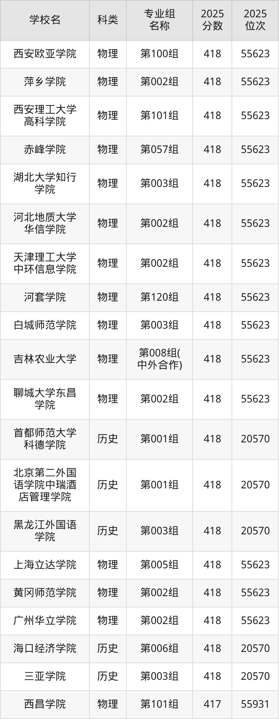 2025年内蒙古历史类本科线为418分,压线能上的本科大学共计5所,对应大学最低位次排名为20570名。民办大学有首都师范大学科德学院、黑龙江外国语学院、海口经济学院、三亚学院等。