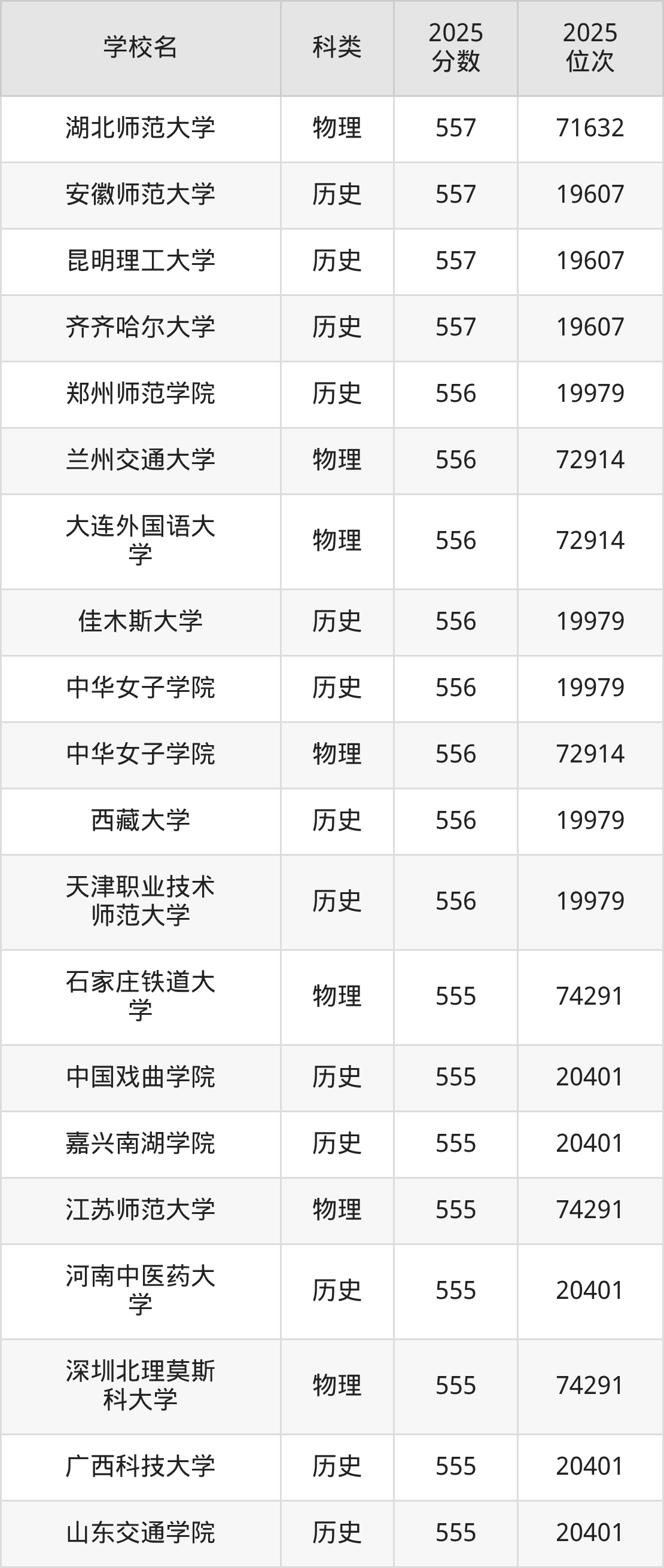 以河北物理类为例,558分能上的本科大学有河北科技学院(位次排名224230名)、山西中医药大学(位次排名106095名)、河北大学(位次排名150409名)。