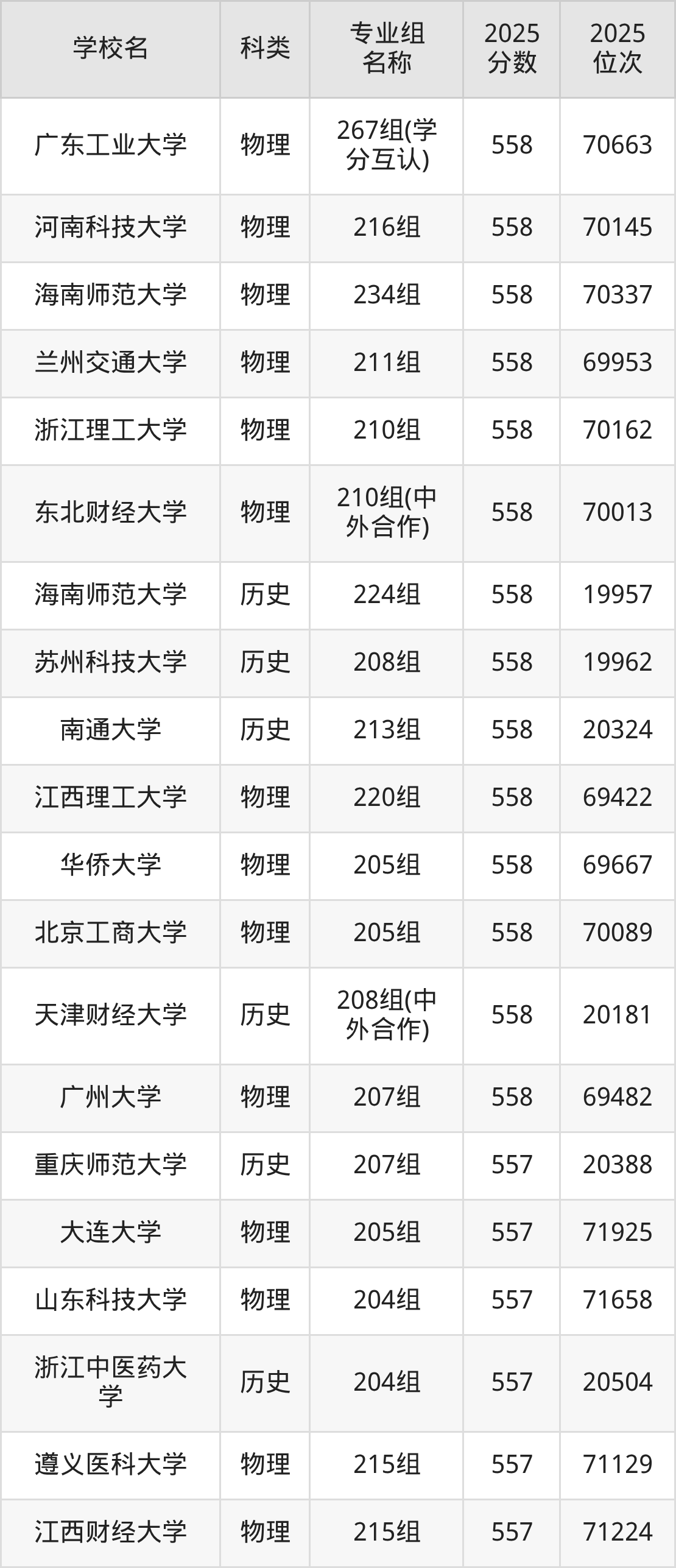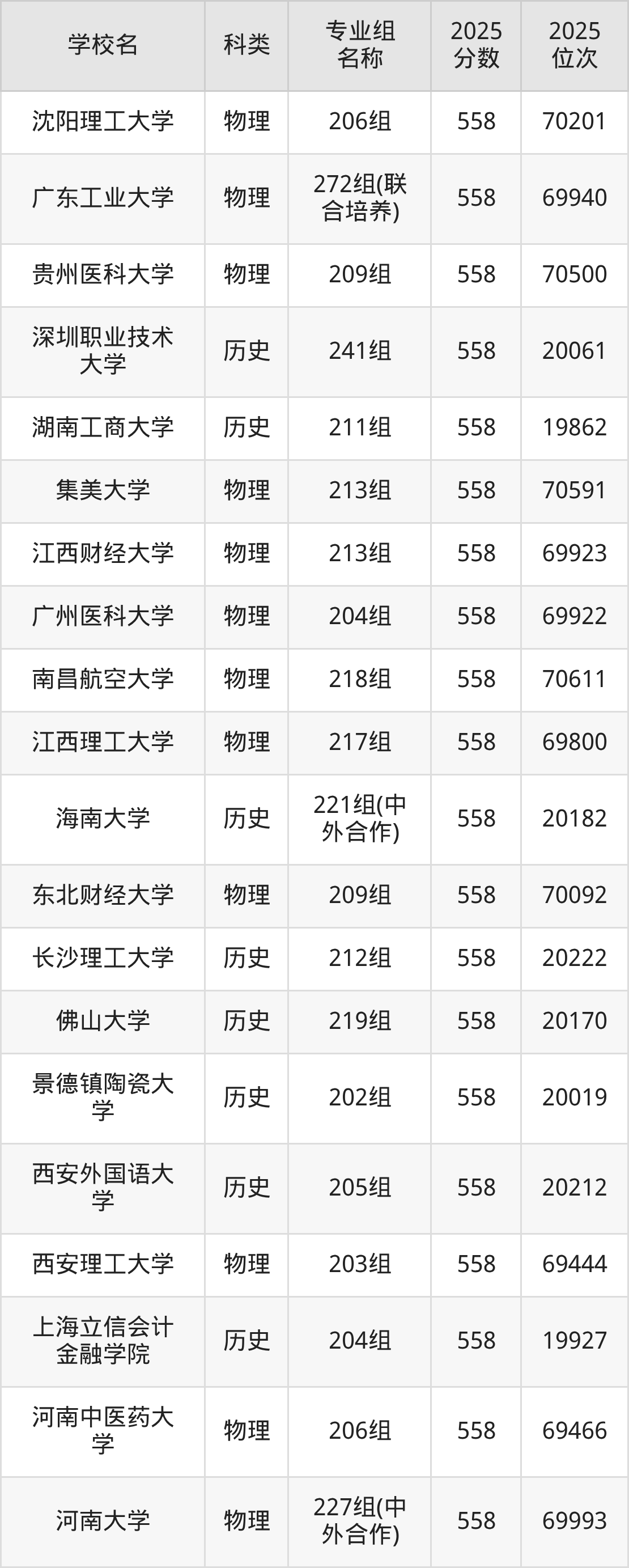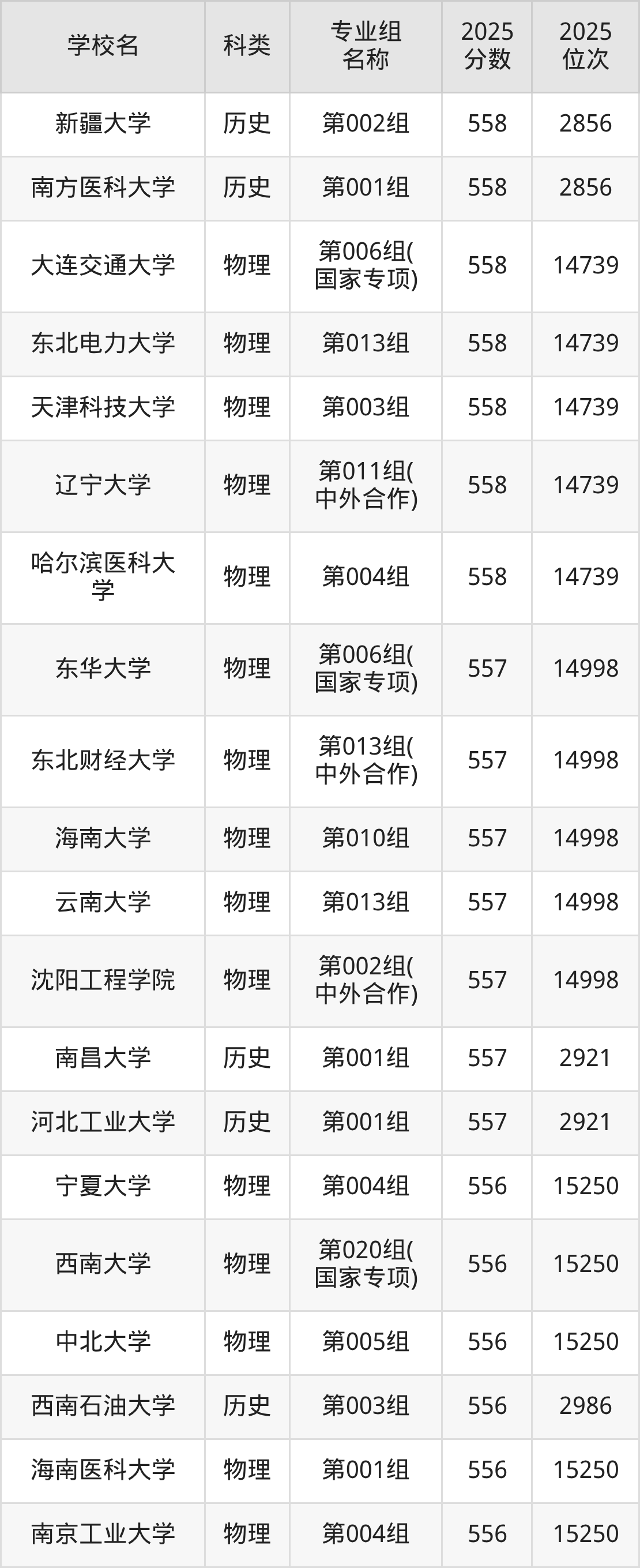 除上述院校外,558分可上的公办本科大学还有山东师范大学(第009组537分,位次20340名)、吉林财经大学(第005组507分,位次29828名)。