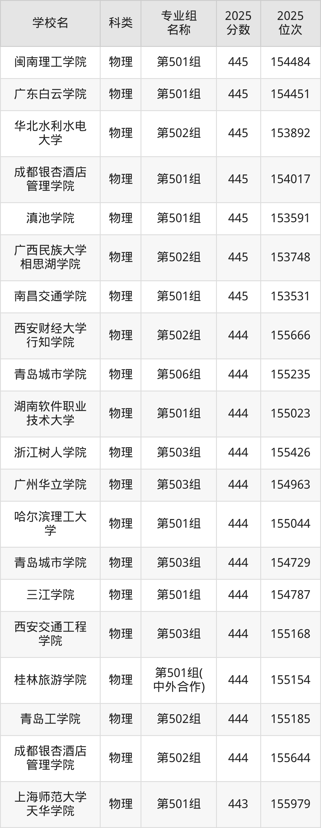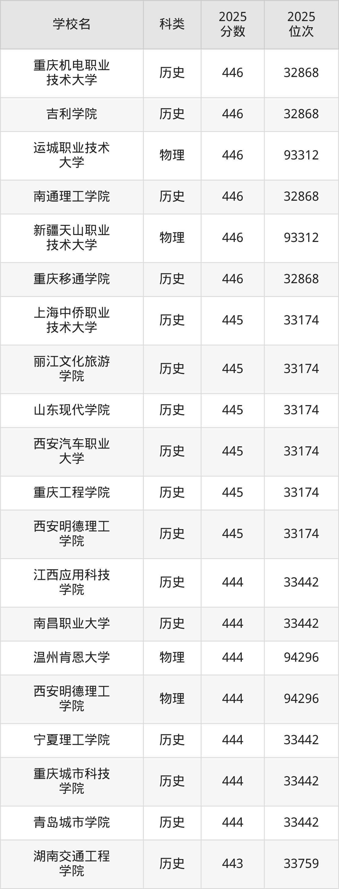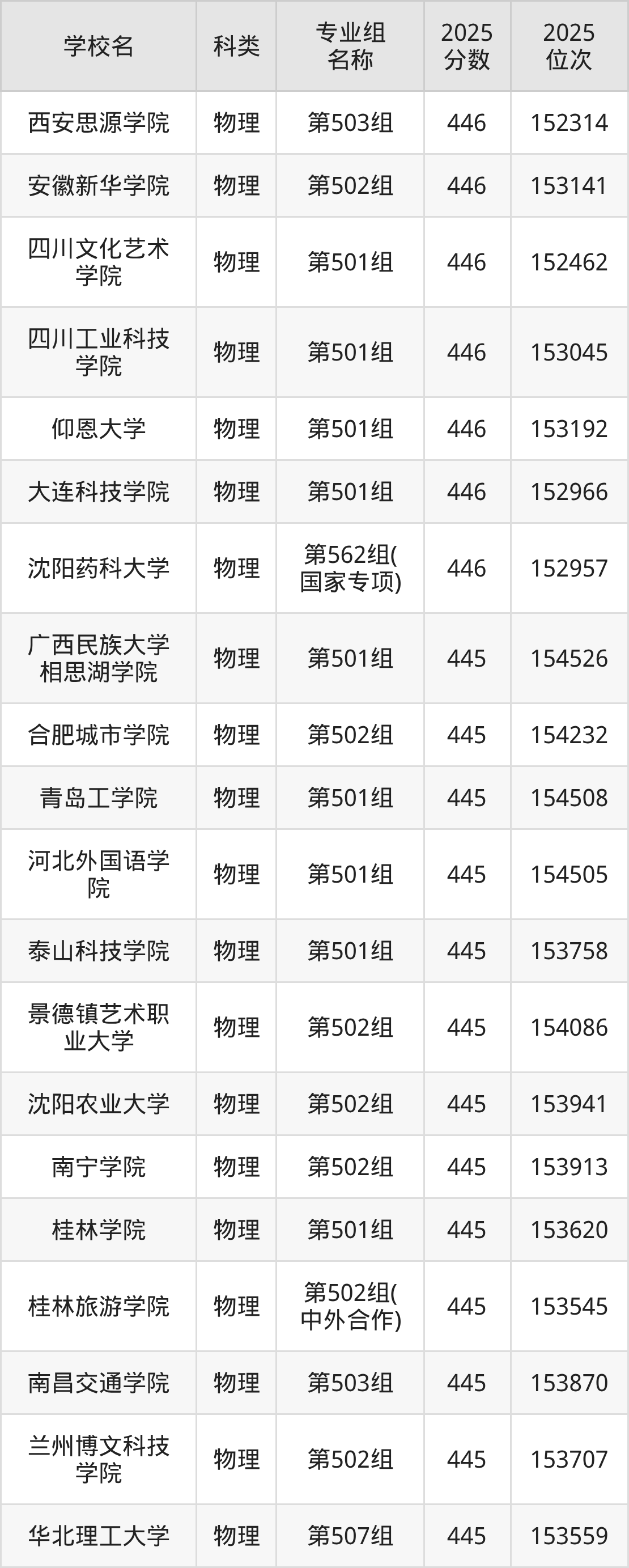 以江西物理类为例,446分能上的本科大学有兰州博文科技学院(位次排名153707名)、华北水利水电大学(位次排名153892名)、西安欧亚学院(位次排名172066名)。