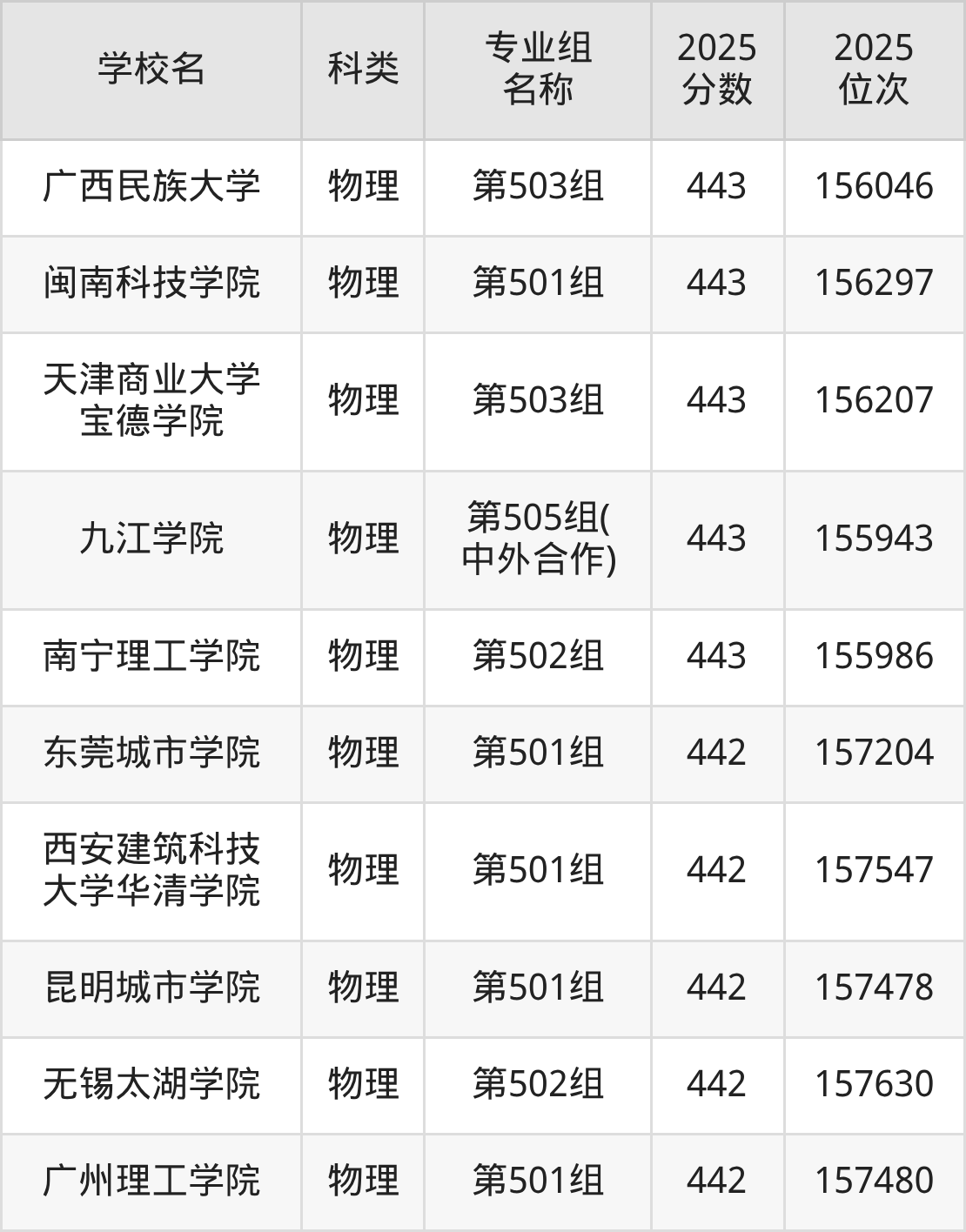 2025年江西物理类本科线为429分,446分能上的本科大学共计181所,其中公办大学录取位次排名最低的是安徽工程大学(第501组429分),其2025最低位次为172066名。