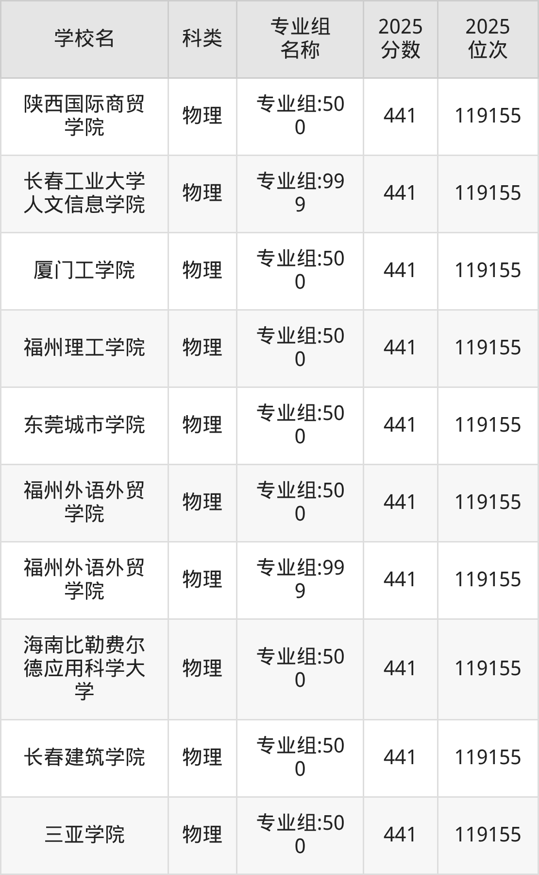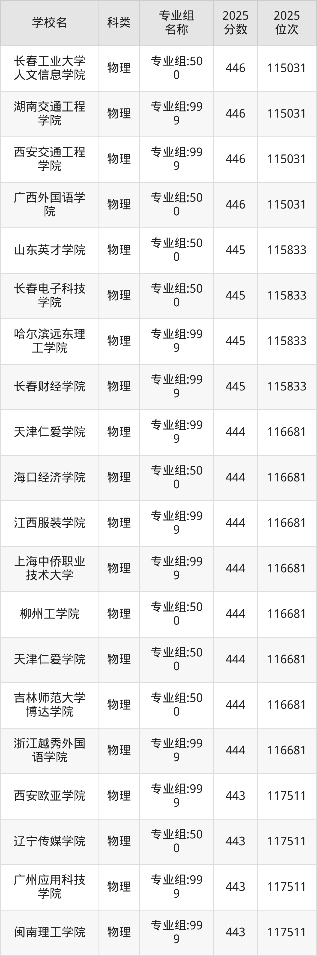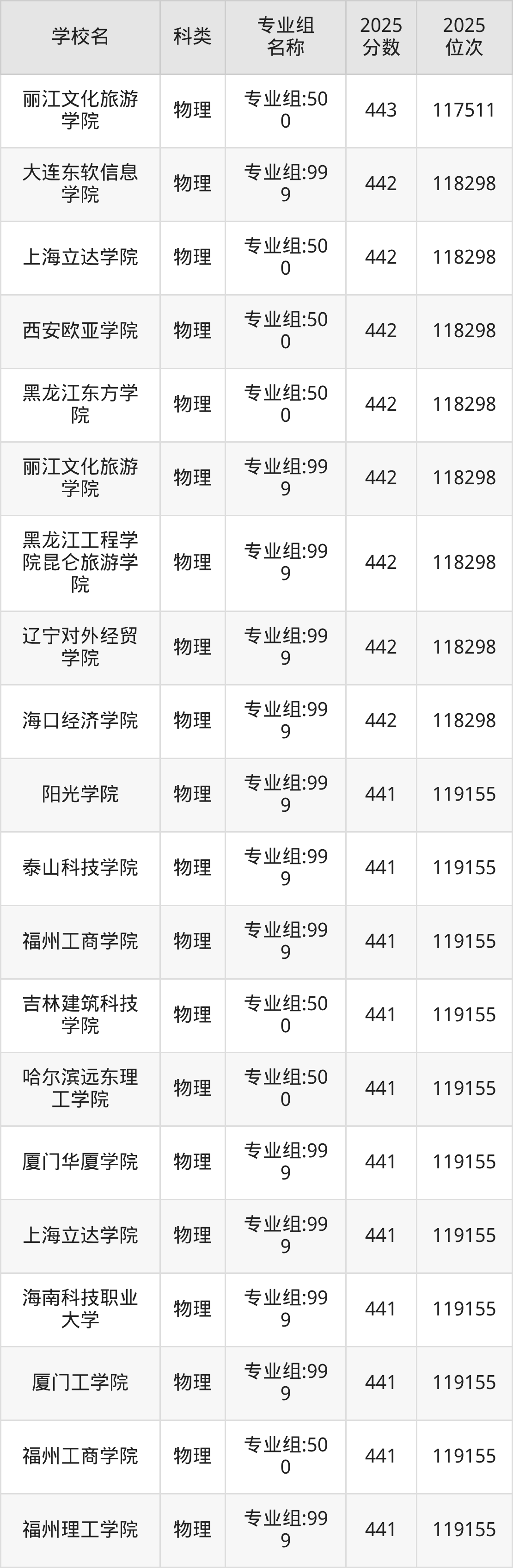 2025年福建物理类本科线为441分,446分能上的本科大学共计49所,其中民办大学录取位次排名最低的是山东英才学院(专业组:999441分,位次119155名),即代表考生省排名位次在119155名及以内就可以报考民办本科。