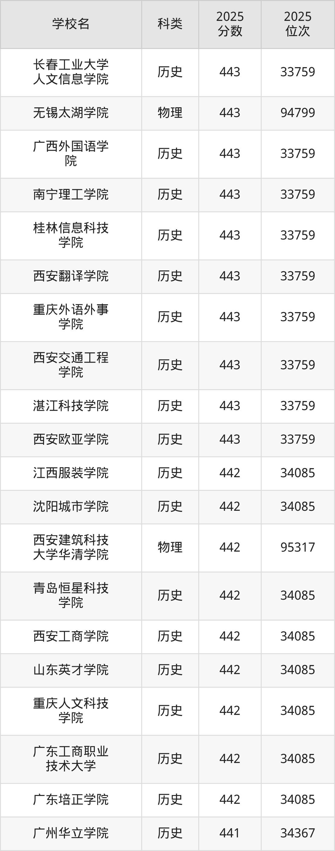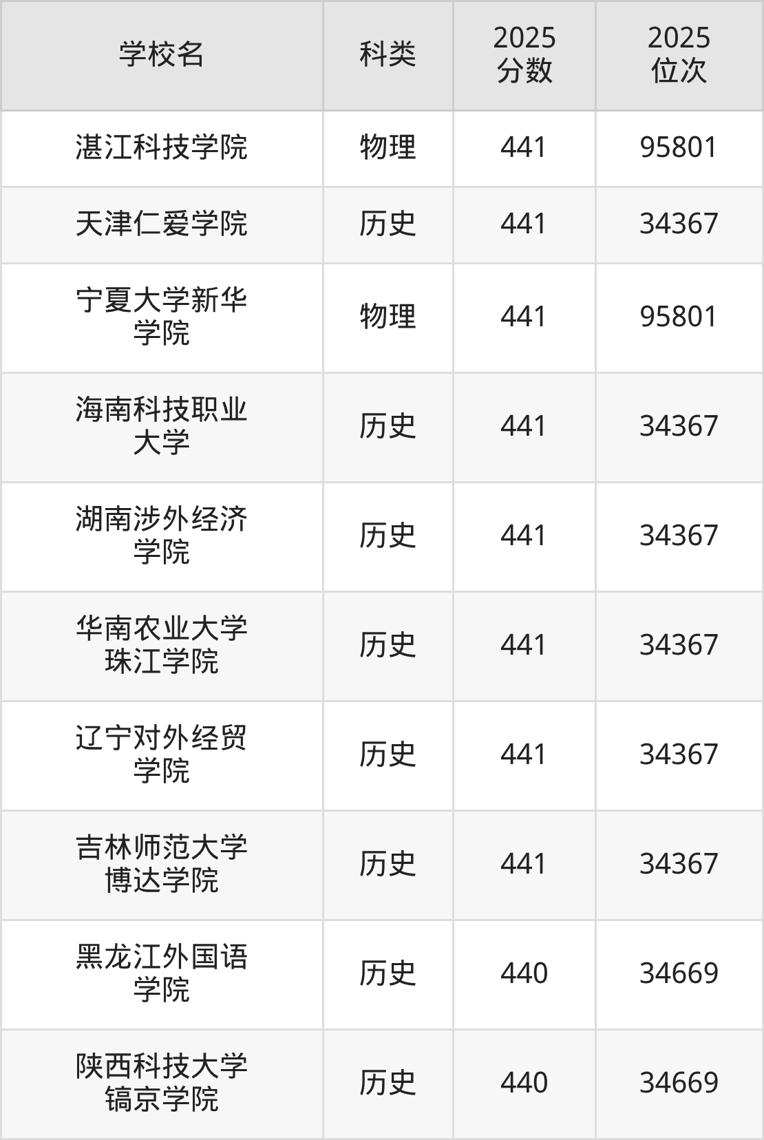 而位次最低的民办院校有江西应用科技学院、西安交通工程学院、湖南应用技术学院、辽宁传媒学院,分数为425分,对应最低位次排名为103219名。