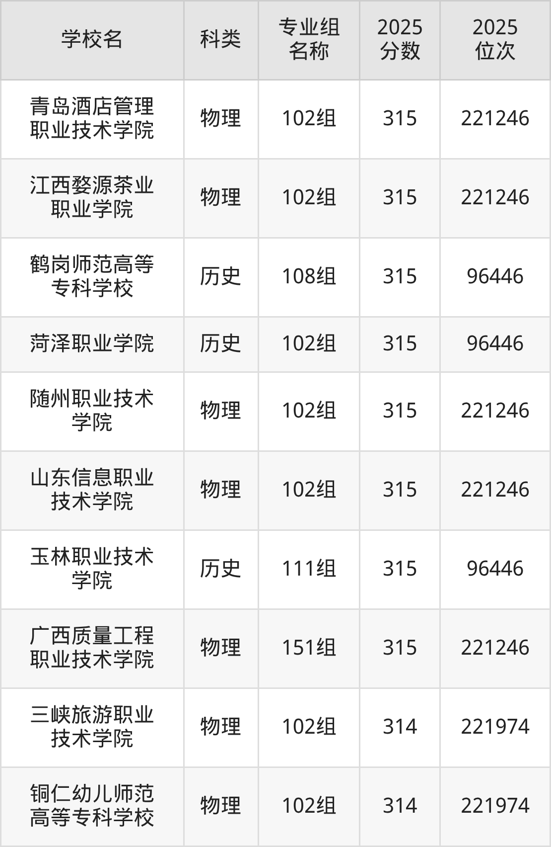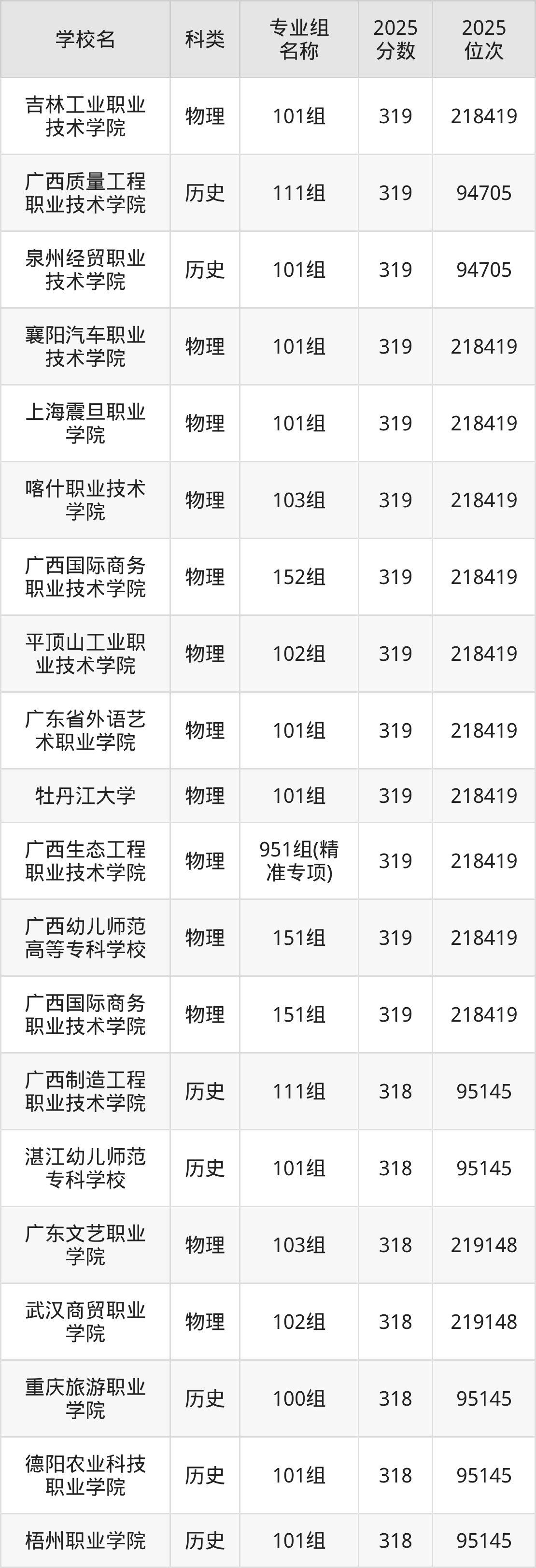 2025年广西物理类专科线为200分,319分能上的专科学校共计348所,其中公办大学录取位次排名最低的是阜新高等专科学校(101组204分),其2025最低位次为260025名。