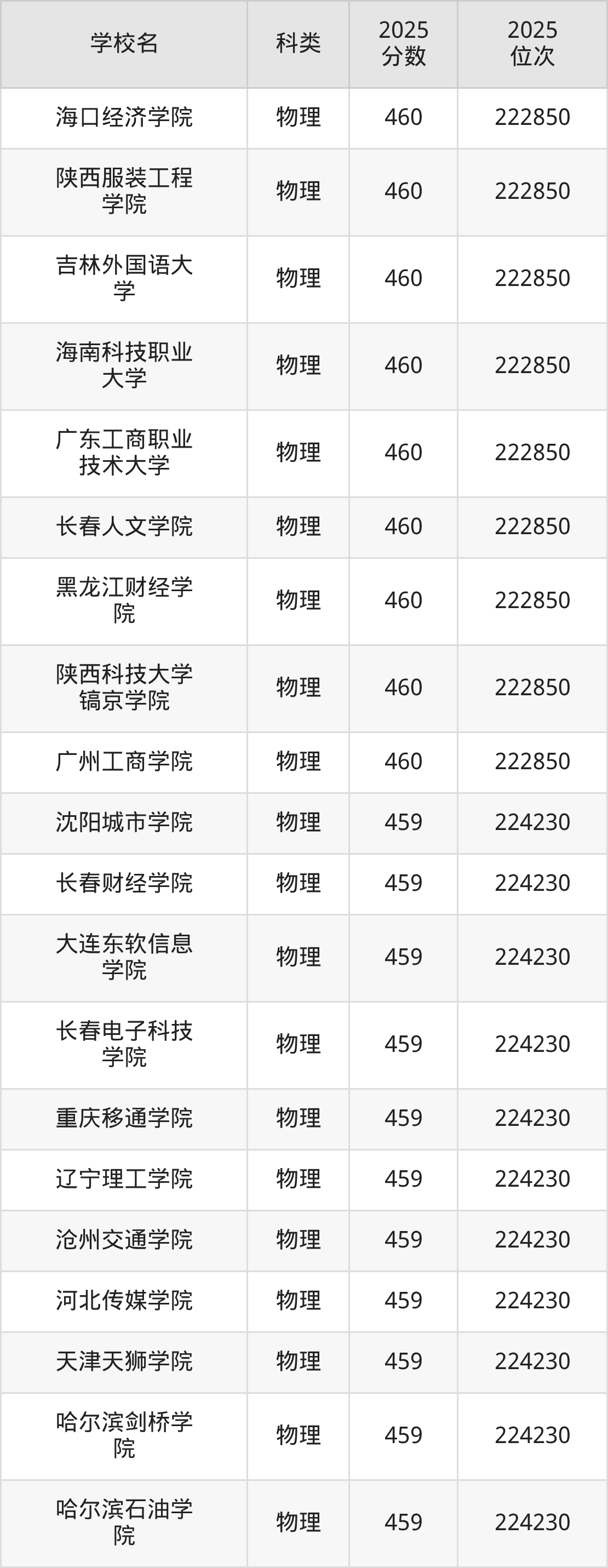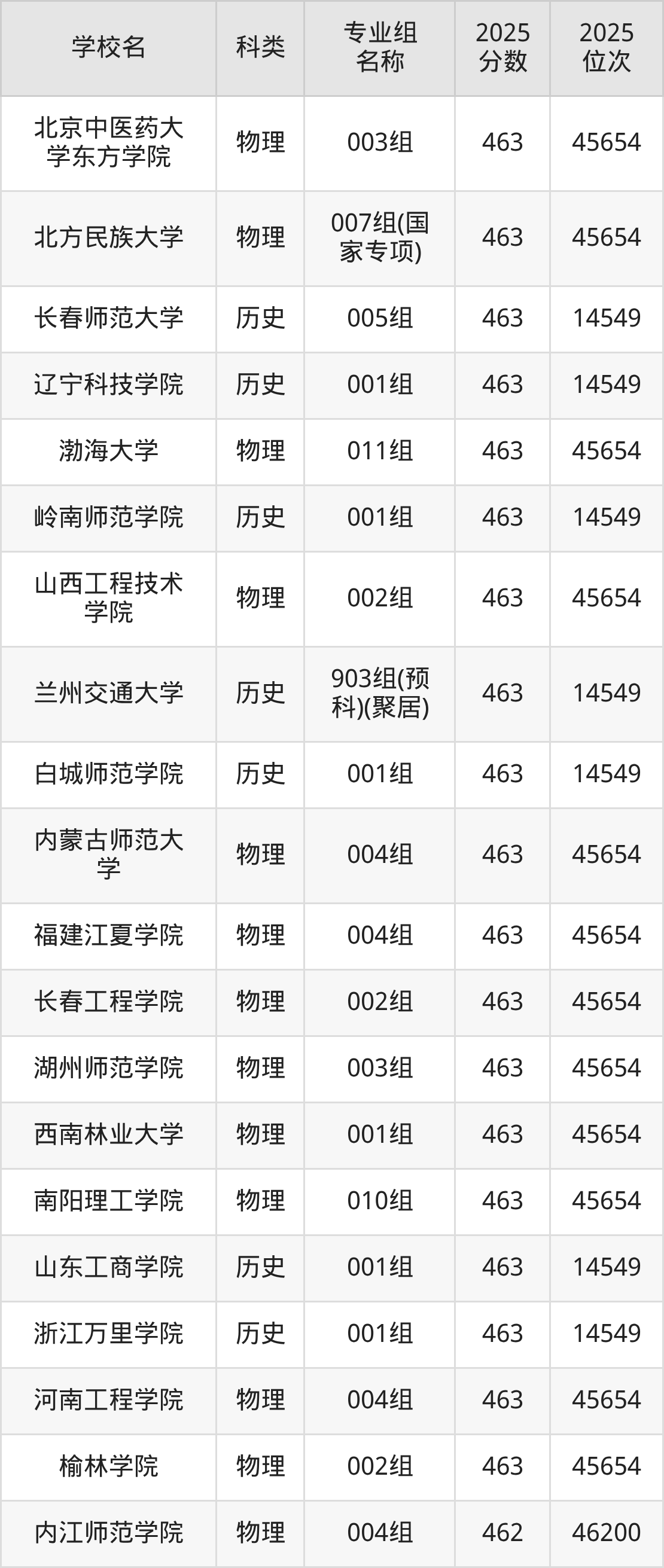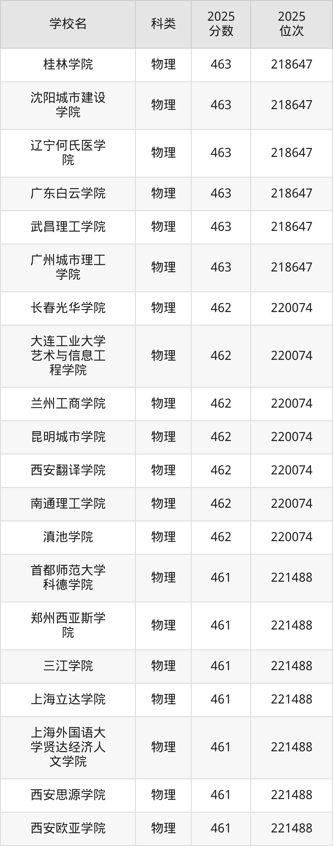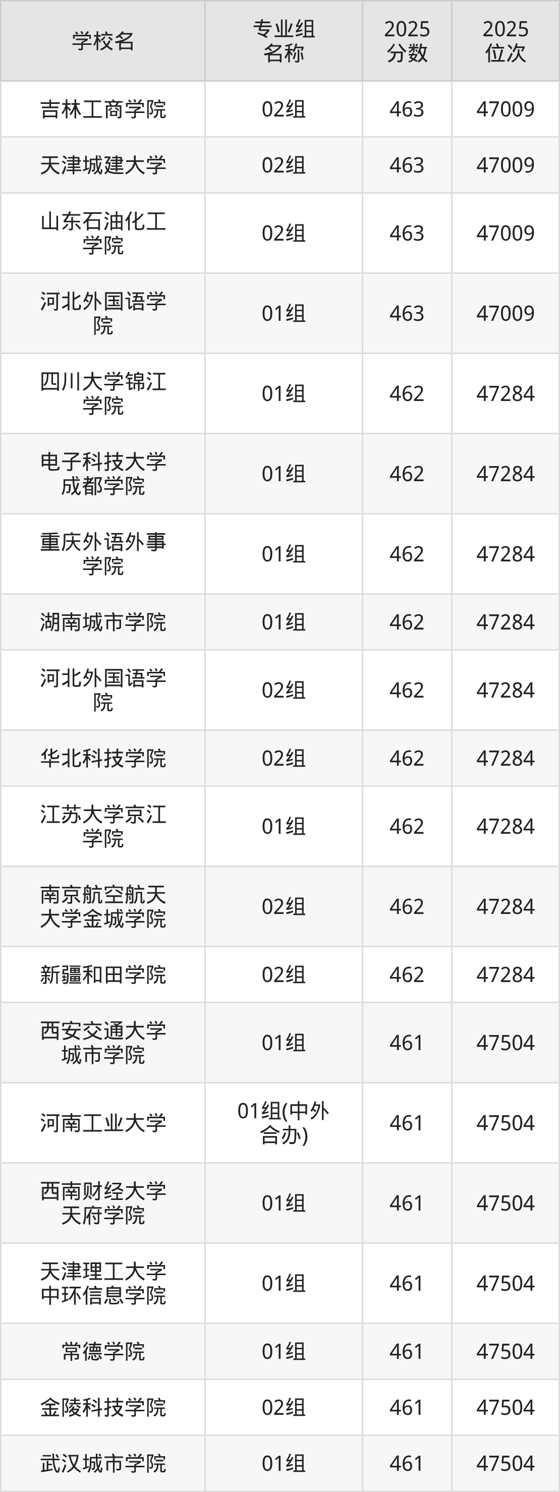 除上述院校外,463分可上的民办二本大学还有广东白云学院(463分,位次218647名)、长春人文学院(460分,位次222850名)。
