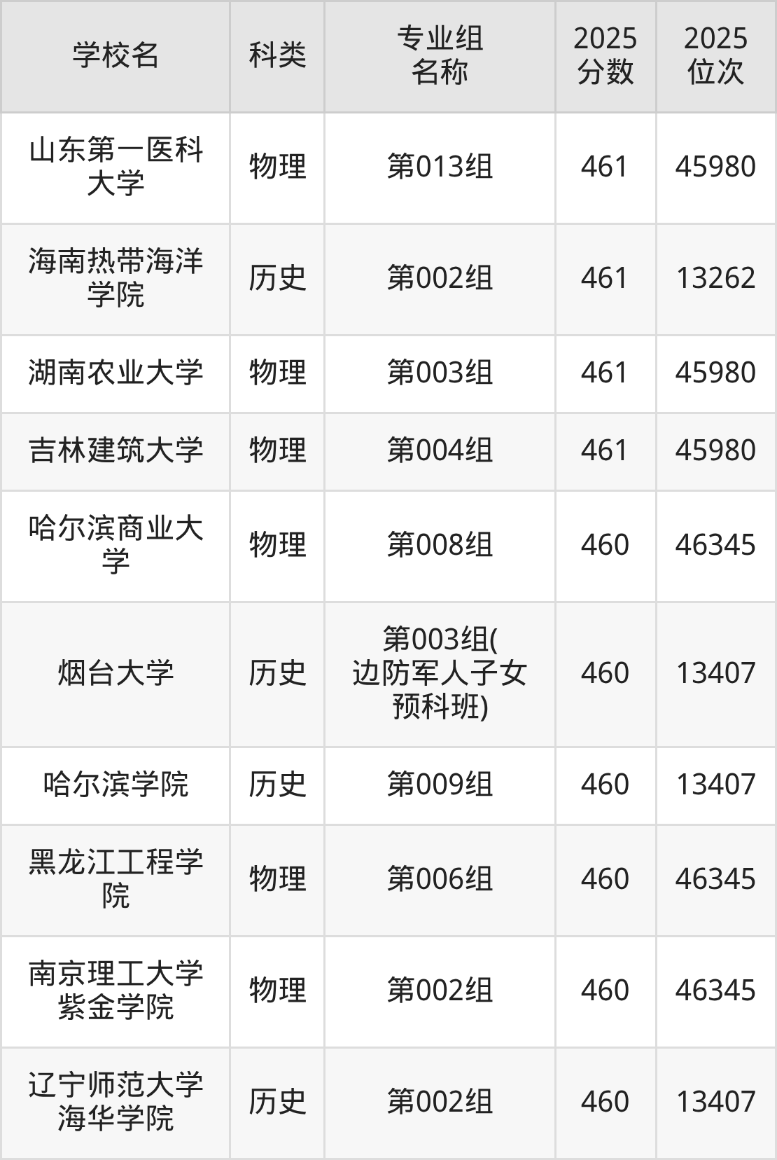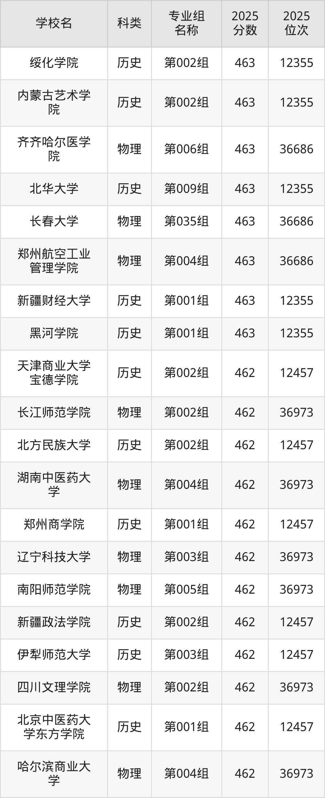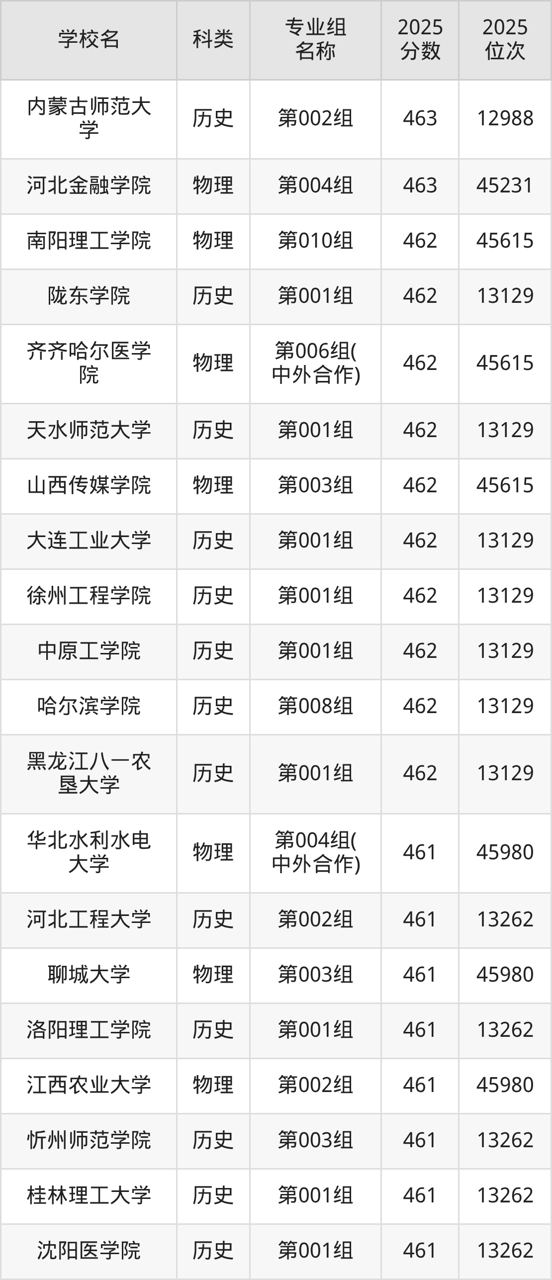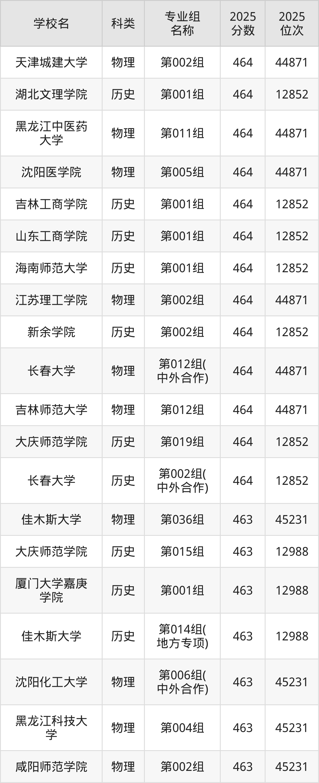 2025年黑龙江历史类本科线为405分,464分能上的二本大学共计262所,其中公办大学录取位次排名最低的是湖南科技大学(第001组405分),其2025最低位次为22977名。