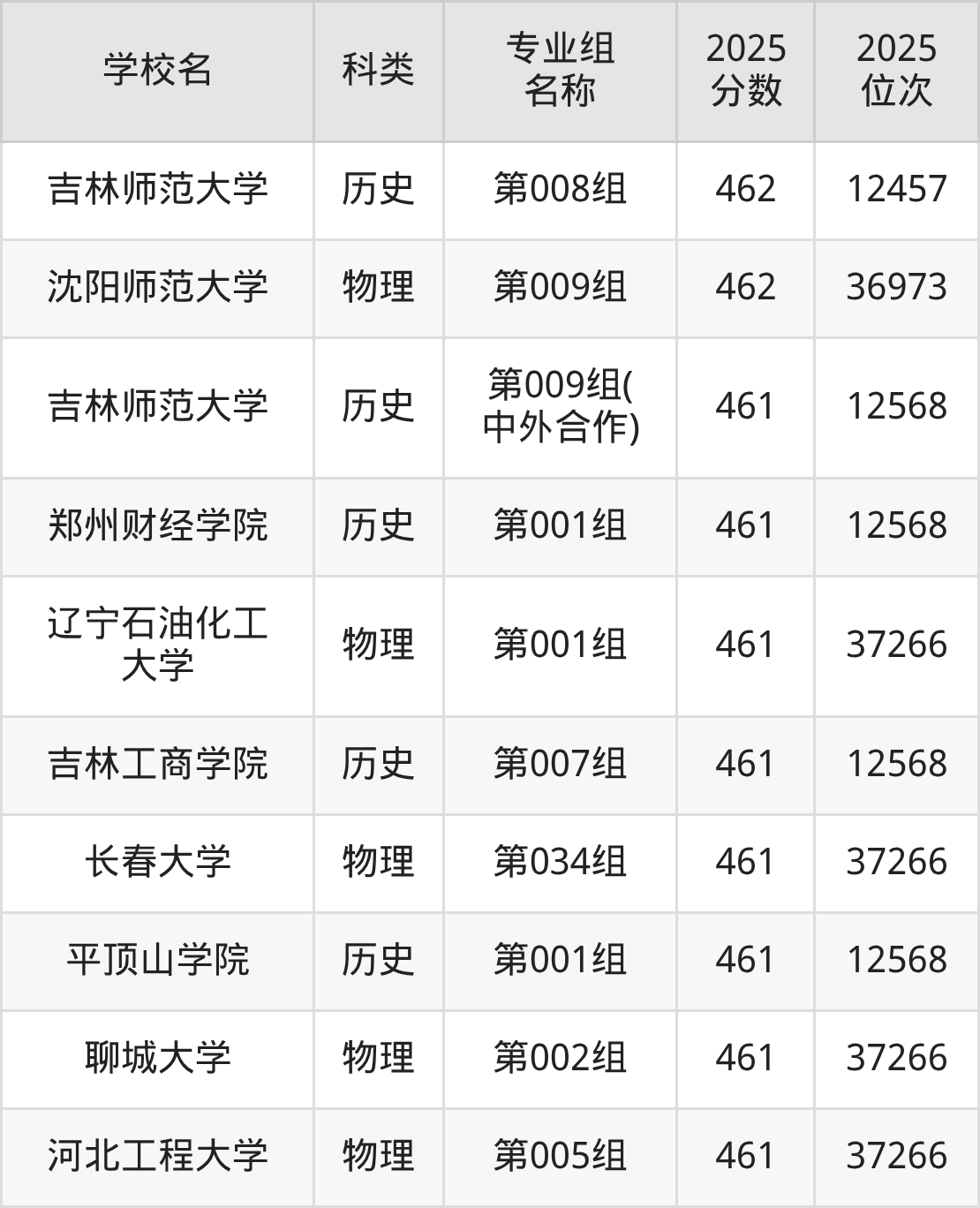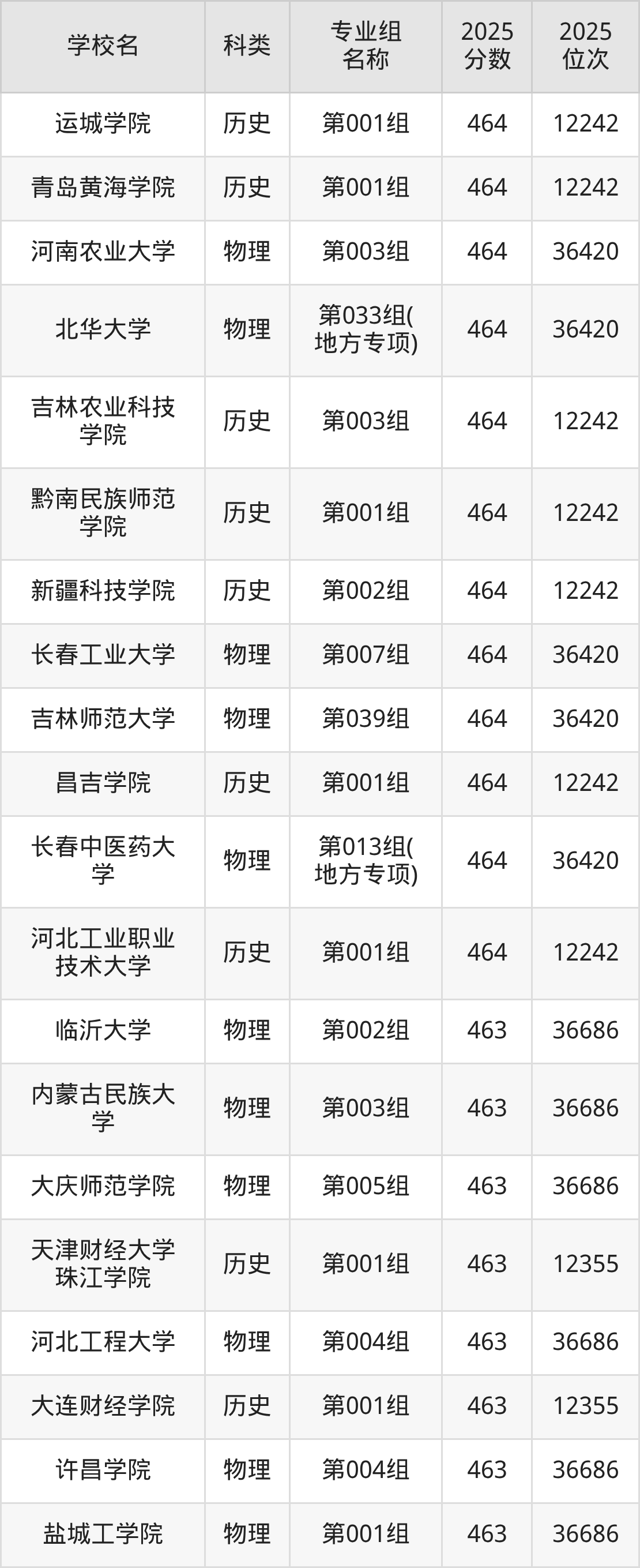2025年吉林物理类本科线为340分,464分能上的二本大学共计350所,其中公办大学录取位次排名最低的是聊城大学(第004组(中外合作)340分,位次69405名),即代表考生省排名位次在69405名及以内就可以报考公办本科。