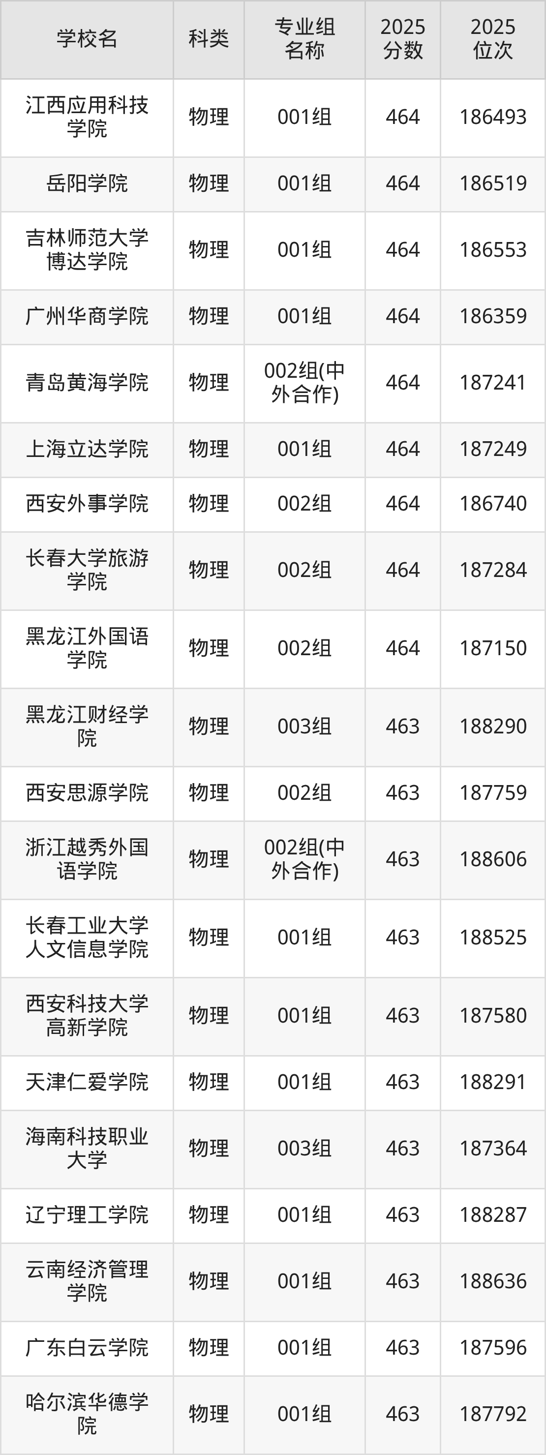 除上述院校外,464分可上的民办二本大学还有上海建桥学院(003组463分,位次188030名)、沈阳城市学院(002组462分,位次188716名)。