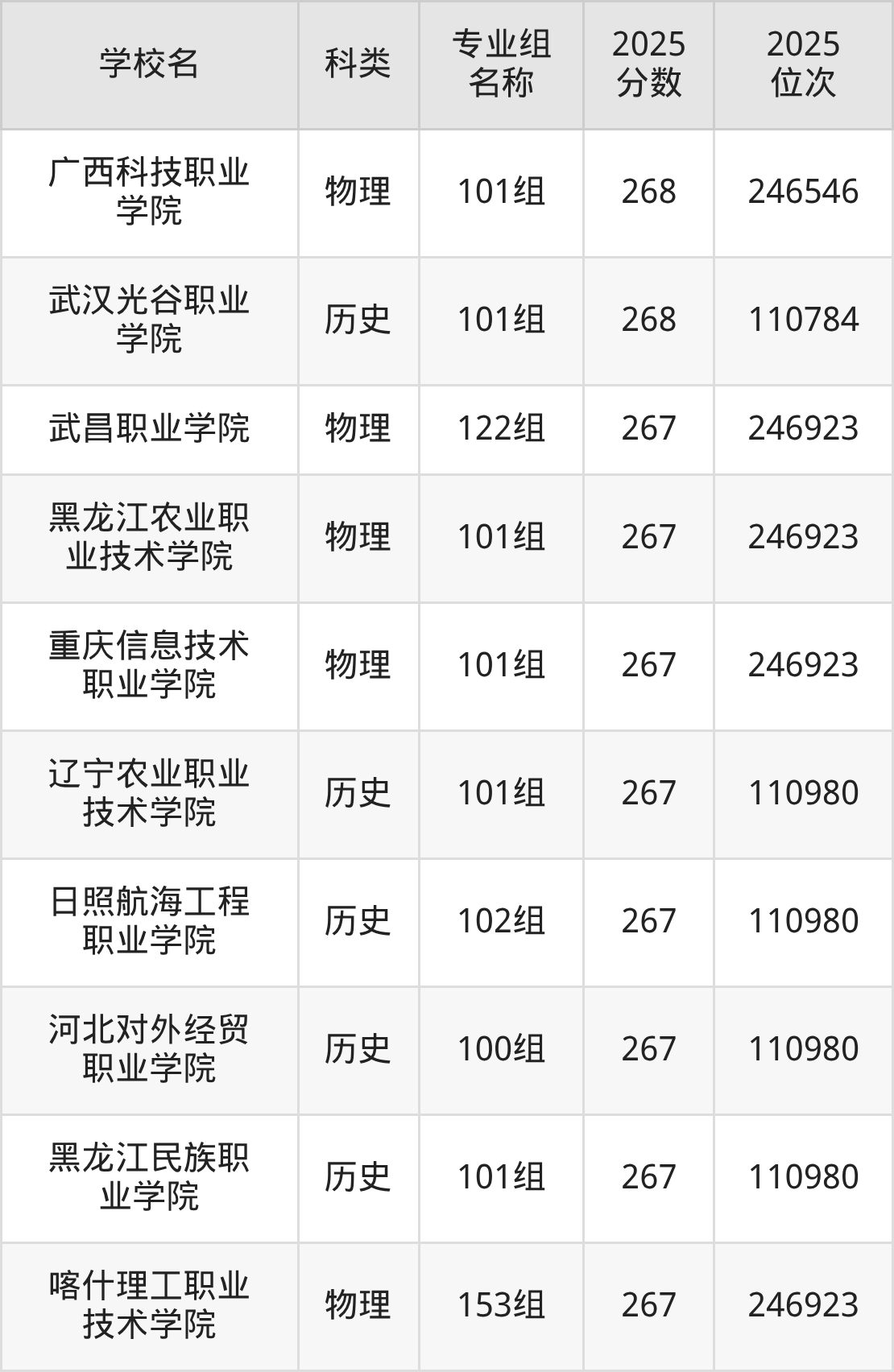2025年广西物理类专科线为200分,275分能上的专科学校共计180所,其中公办大学录取位次排名最低的是阜新高等专科学校(101组204分,位次260025名),即代表考生壮族自治区排名位次在260025名及以内就可以报考公办专科。