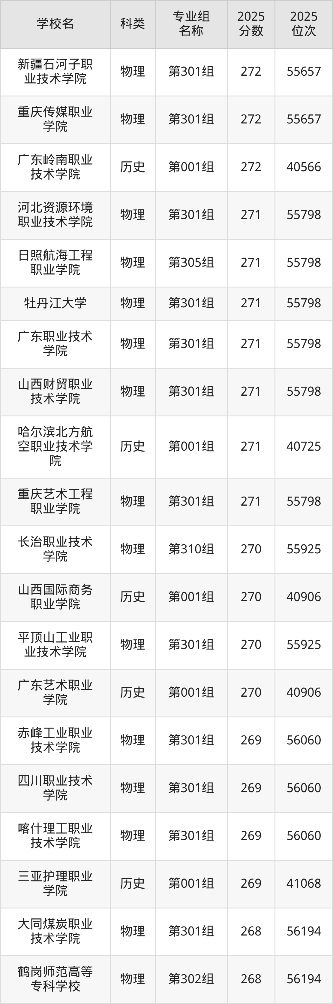 2025年山西物理类专科线为100分,275分能上的专科学校共计215所,其中最低分公办院校为长治职业技术学院(第304组104分),对应最低位次为62332名。因此想上公办专科的考生省排名位次至少要在62332名以内。