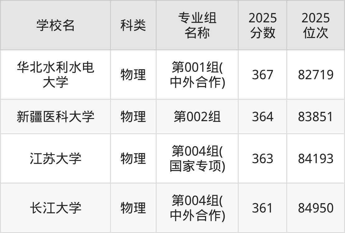 2025年黑龙江物理类本科线为360分,367分能上的一本大学共计4所,其中公办大学录取位次排名最低的是长江大学(第004组(中外合作)361分),其2025最低位次为84950名。