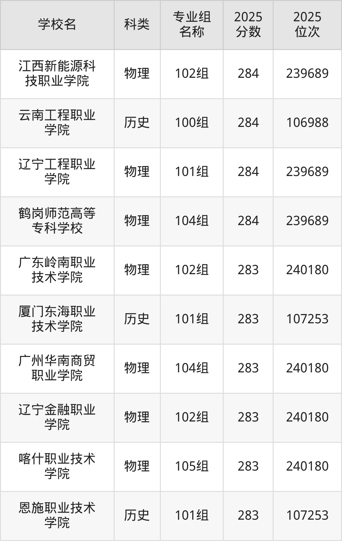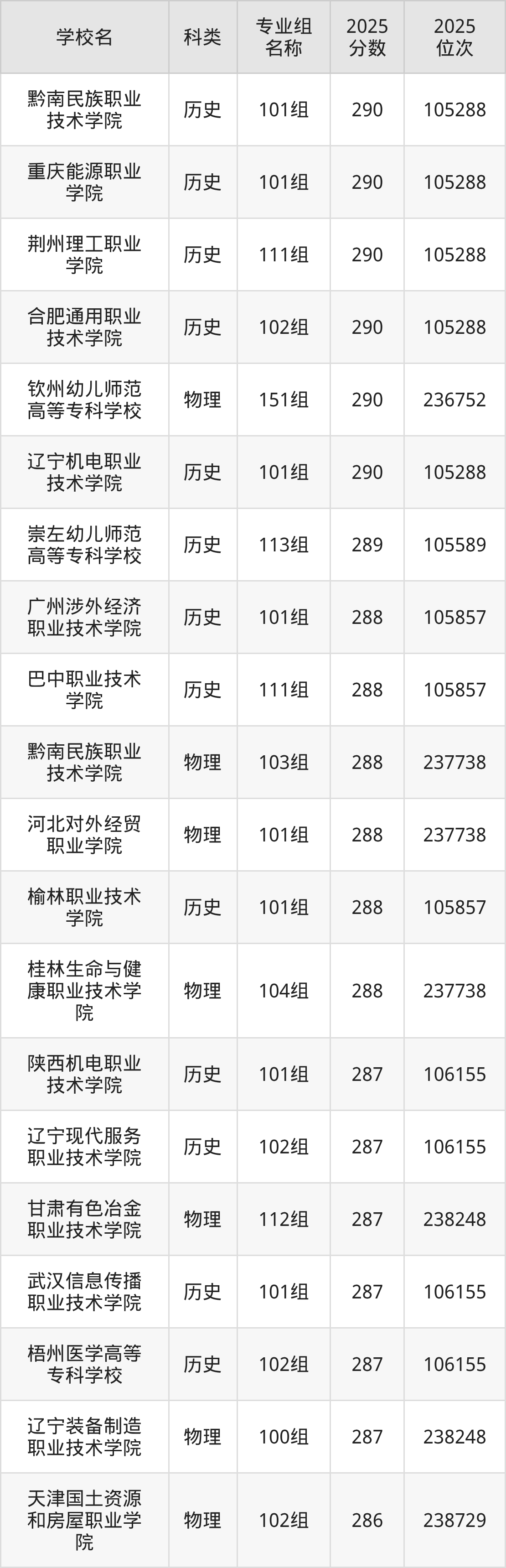 2025年广西物理类专科线为200分,290分能上的专科学校共计230所,其中公办大学录取位次排名最低的是阜新高等专科学校(101组204分),其2025最低位次为260025名。