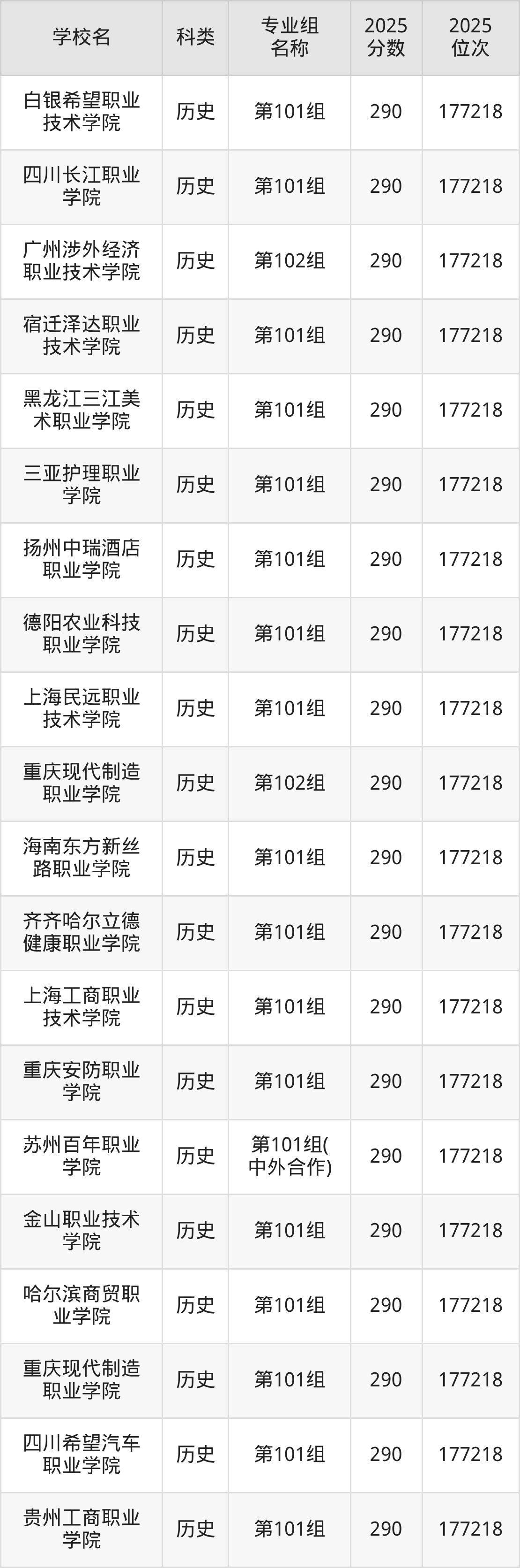 以广西历史类为例,290分能上的专科学校有塔里木职业技术学院(位次排名108291名)、石家庄幼儿师范高等专科学校(位次排名108811名)、巴中职业技术学院(位次排名105857名)。