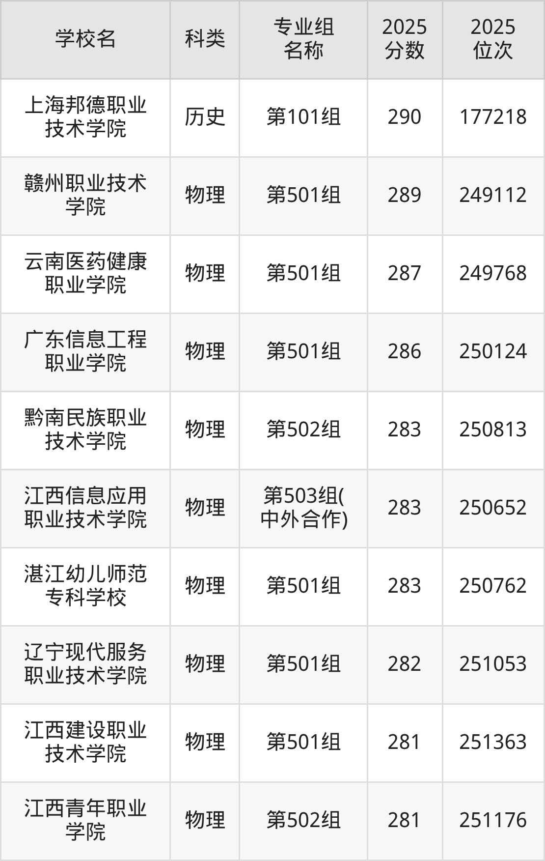 2025年江西物理类专科线为240分,290分能上的专科学校共计317所,其中公办大学录取位次排名最低的是上饶卫生健康职业学院(第501组240分,位次259802名),即代表考生省排名位次在259802名及以内就可以报考公办专科。