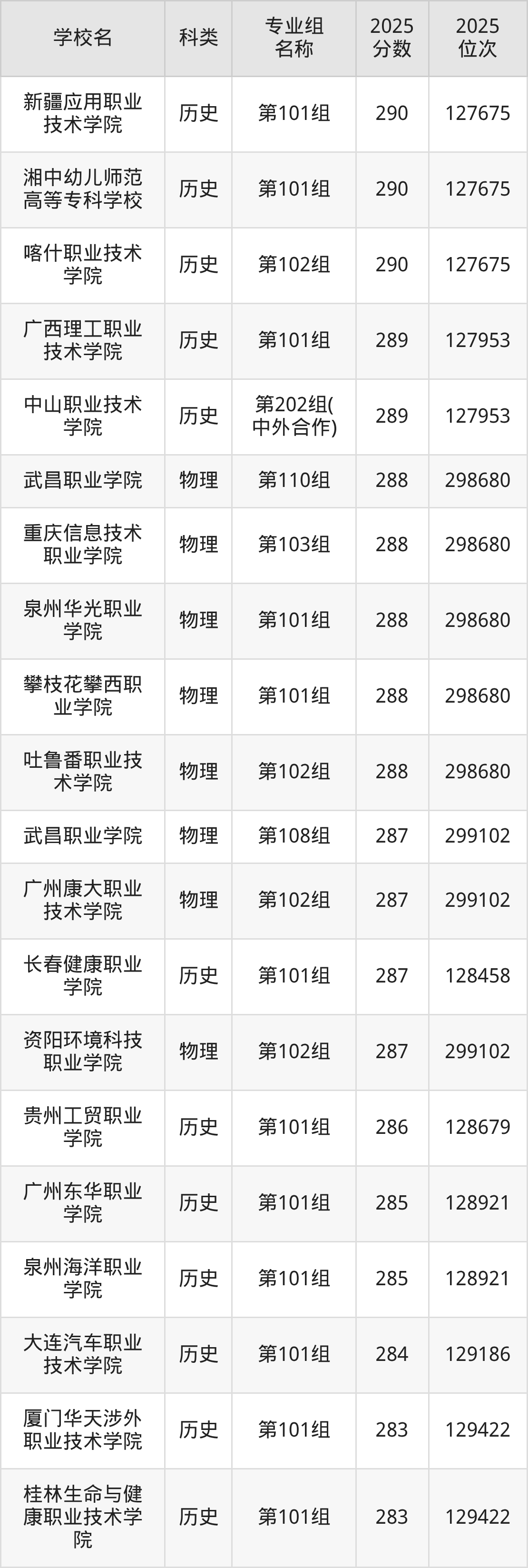 除上述院校外,290分可上的公办专科学校还有新疆应用职业技术学院(第101组290分,位次127675名)、湘中幼儿师范高等专科学校(第101组290分,位次127675名)。