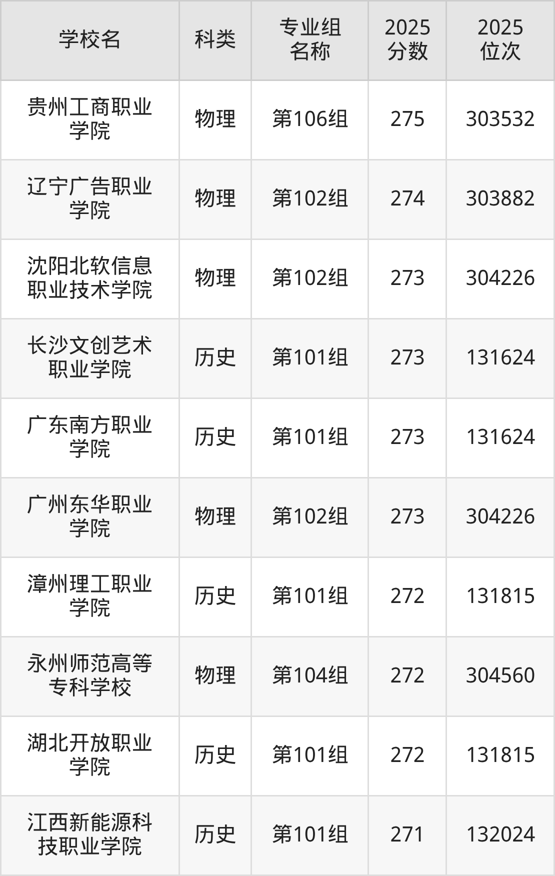 2025年江西历史类专科线为290分,压线能上的专科学校共计36所,对应大学最低位次排名为176757名。公办大学有苏州百年职业学院、赣南卫生健康职业学院。民办大学有上海东海职业技术学院、哈尔滨传媒职业学院、广州涉外经济职业技术学院、宿迁泽达职业技术学院等。
