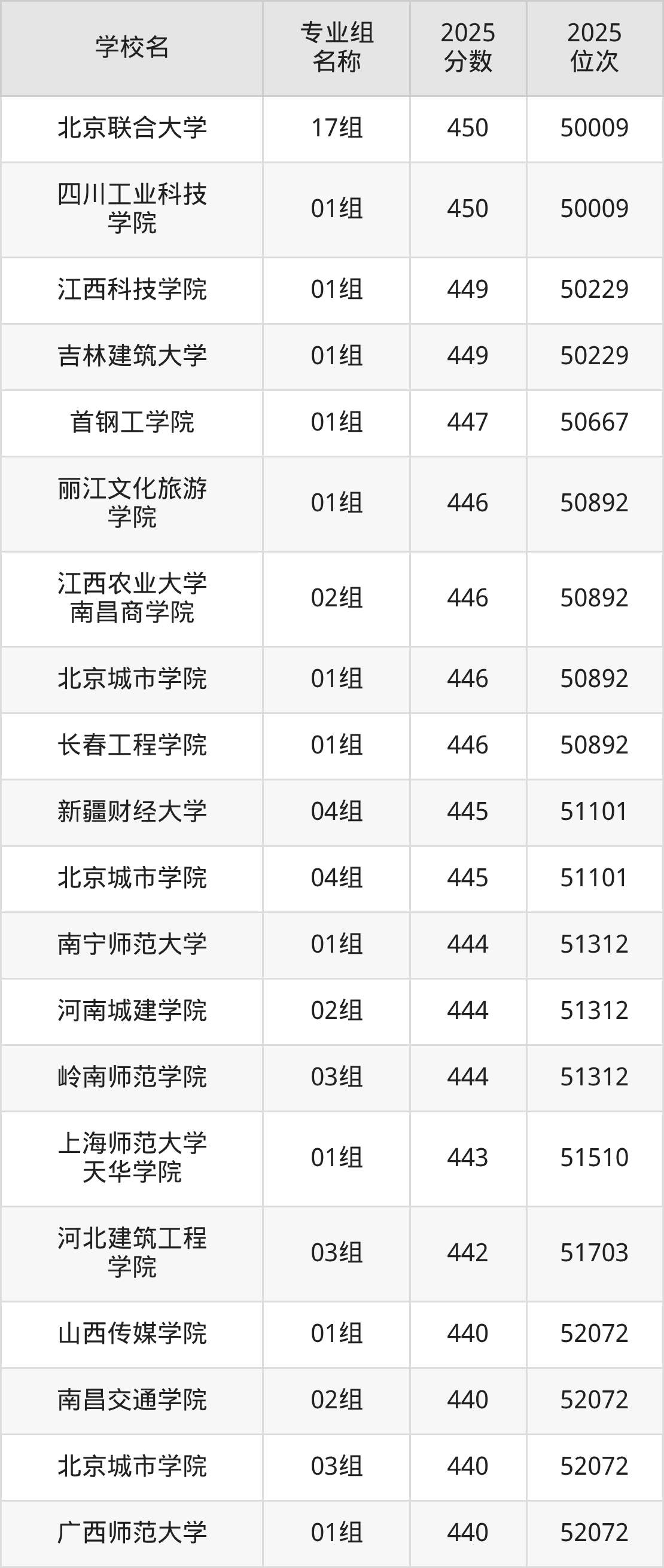二、北京450分能上的本科大学排名表