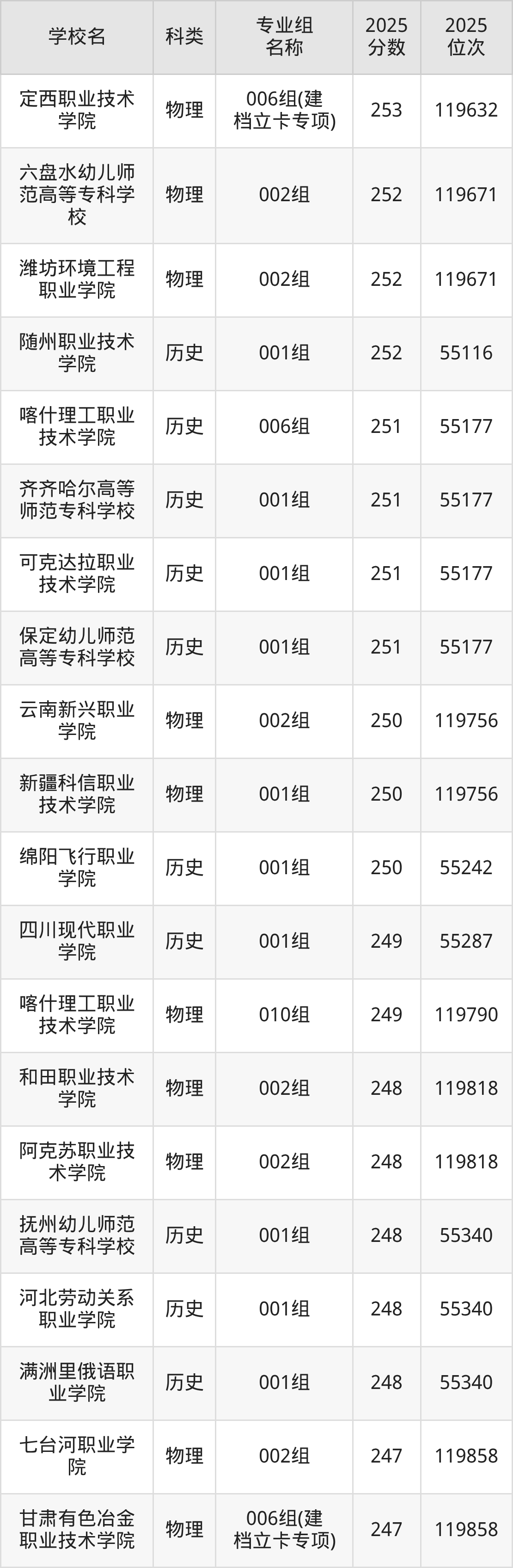 2025年甘肃历史类专科线为160分,258分能上的专科学校共计186所,其中公办大学录取位次排名最低的是罗定职业技术学院(001组160分),其2025最低位次为56978名。