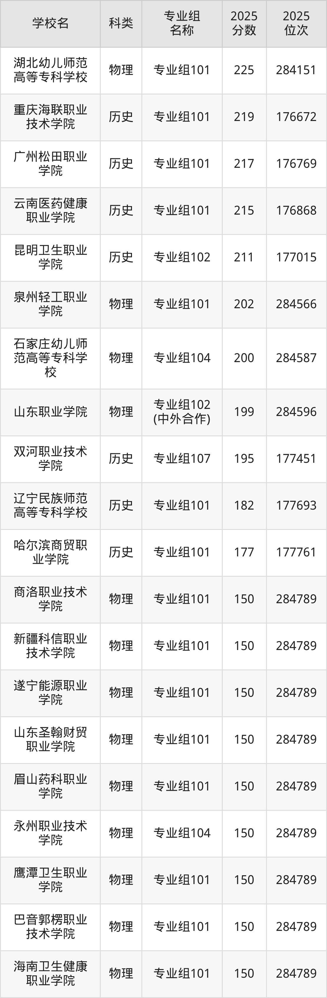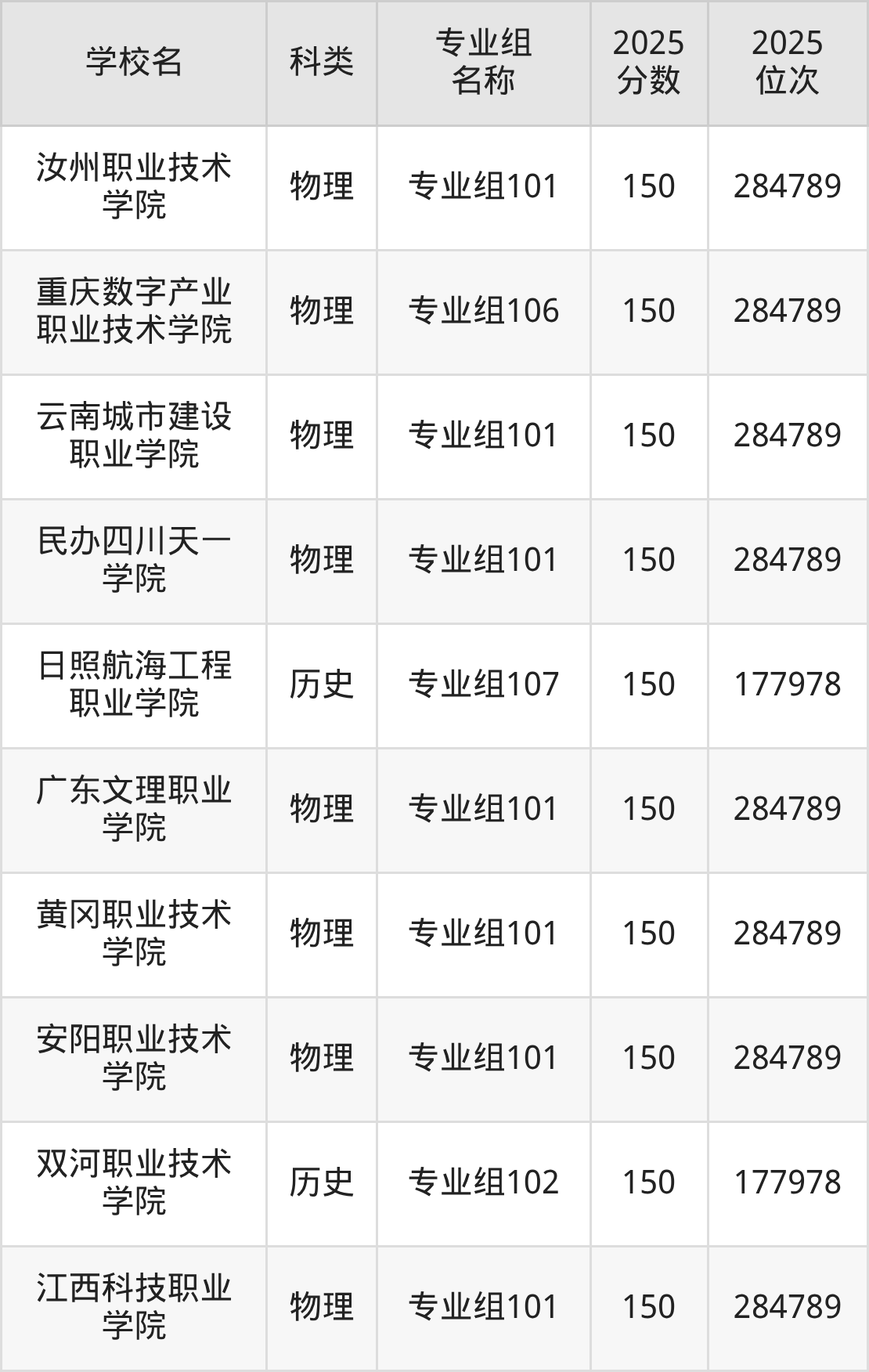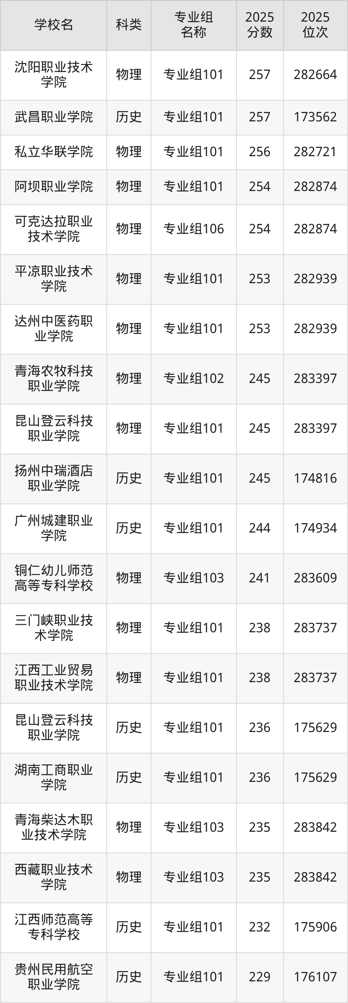 2025年四川物理类专科线为150分,258分能上的专科学校共计325所,其中公办大学录取位次排名最低的是新星职业技术学院(专业组105150分,位次284789名),即代表考生省排名位次在284789名及以内就可以报考公办专科。