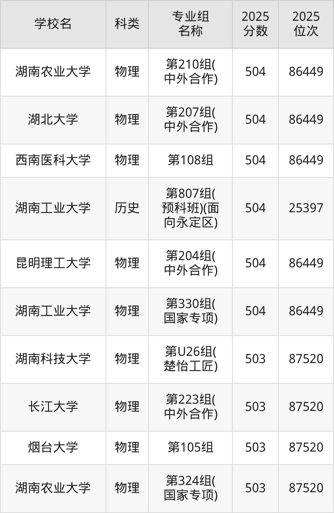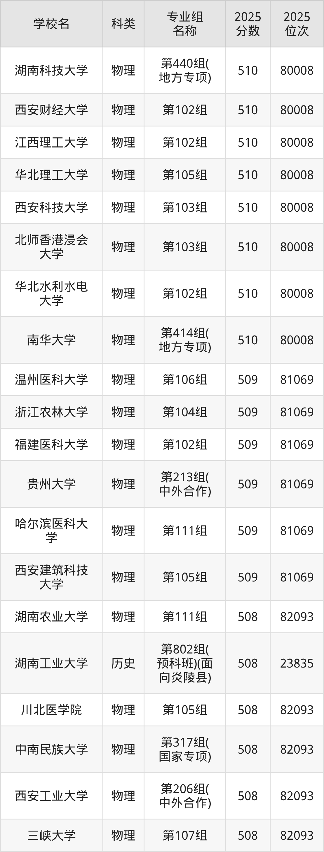 2025年湖南物理类本科线为405分,510分能上的一本大学共计80所,其中公办大学录取位次排名最低的是湖南工业大学(第842组(预科班)(面向北湖区)417分),其2025最低位次为196969名。