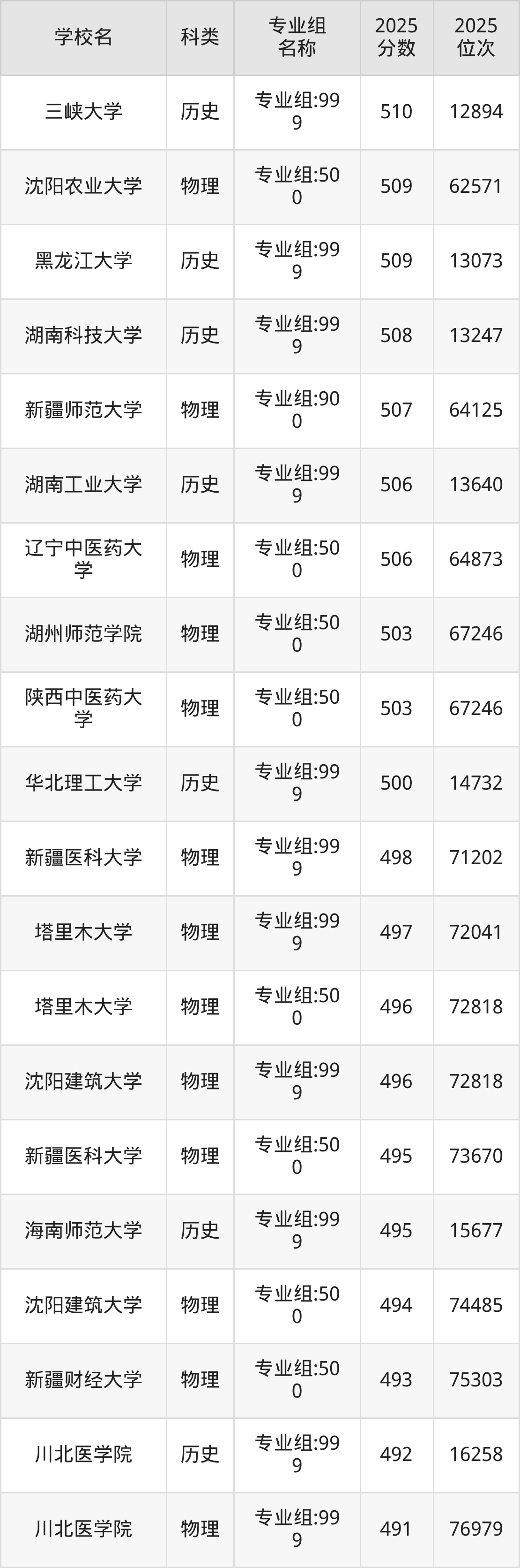 以湖南物理类为例,510分能上的一本大学有湖南科技大学(位次排名87520名)、海南医科大学(位次排名89625名)、湖南工业大学(位次排名103409名)。