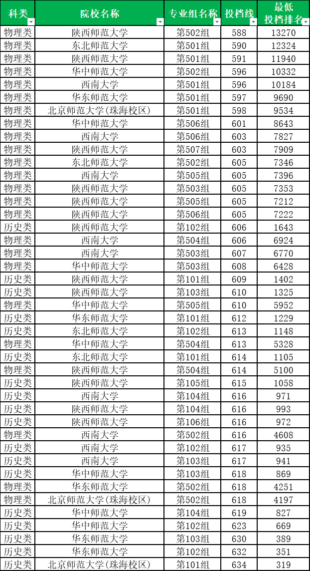 历史类招生专业组共计18个,分数在606分到634分不等,最低分专业组为陕西师范大学第102组,投档最低位次1643名。最高分专业组为北京师范大学(珠海校区)第101组,投档最低位次319名。即历史类考生成绩至少超特控线67分才有机会就读部属师范院校公费师范生。