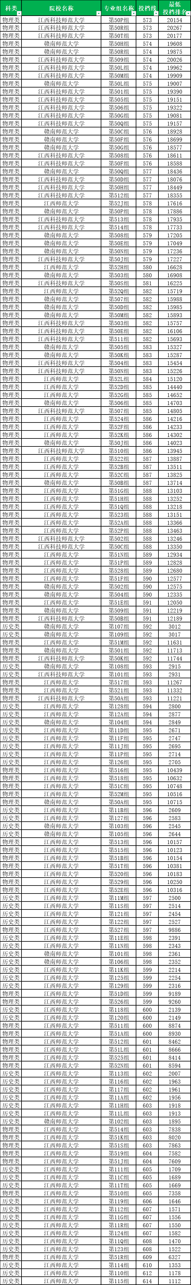 物理类招生专业组共计110个,分数在573分到609分不等,最低分专业组是江西科技师范大学第50P组,最高分专业组是江西师范大学第51R组。即物理类考生成绩至少超特控线68分才有机会就读省属师范院校公费师范生。