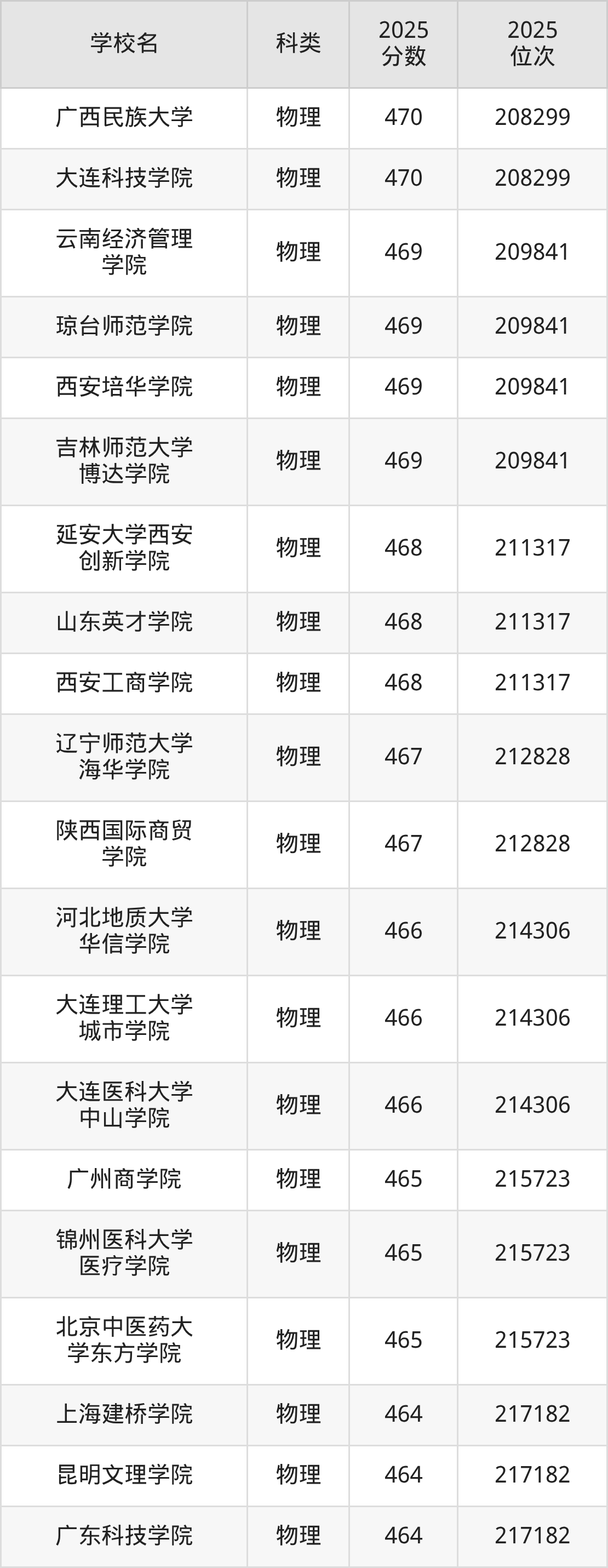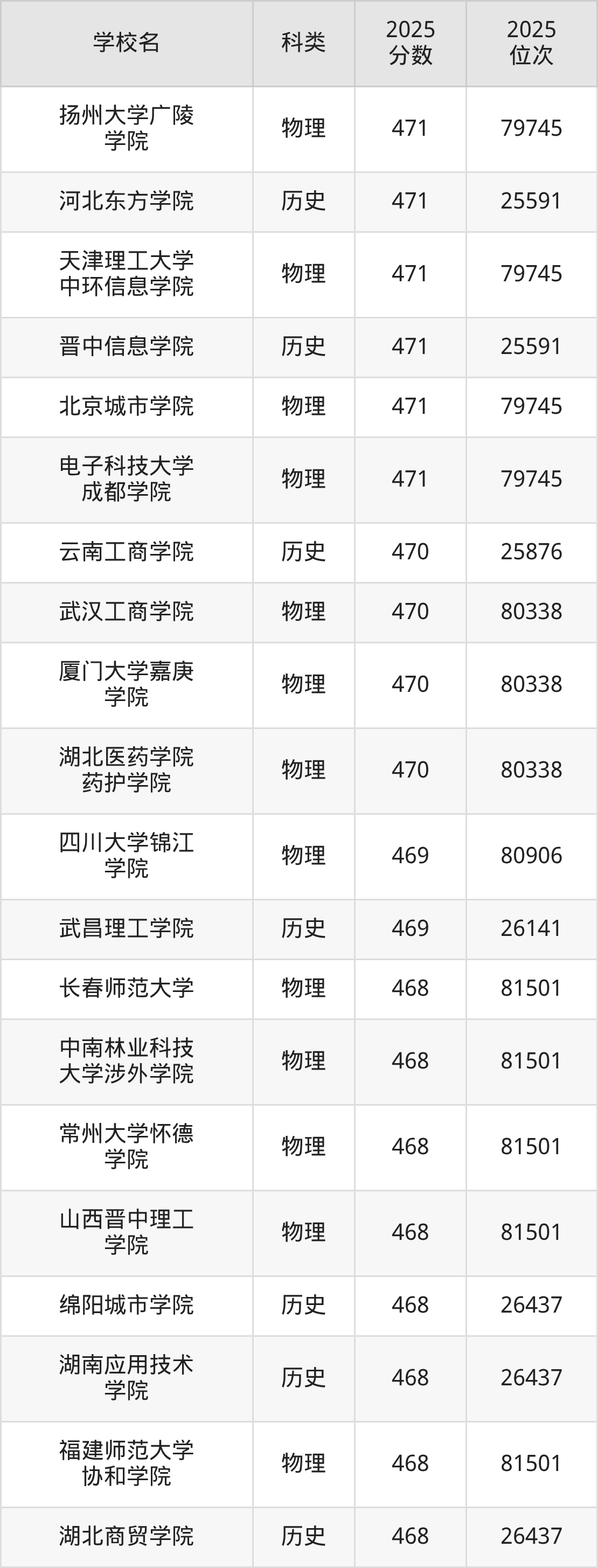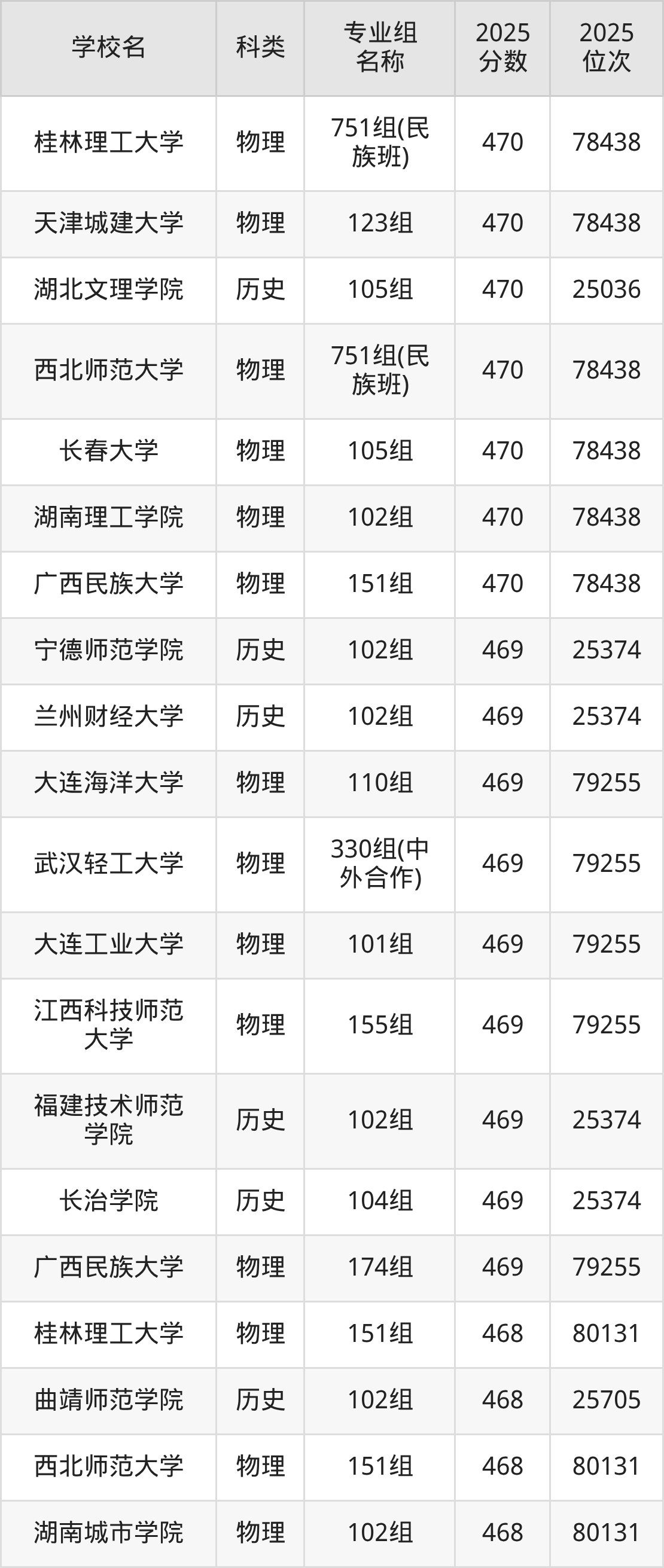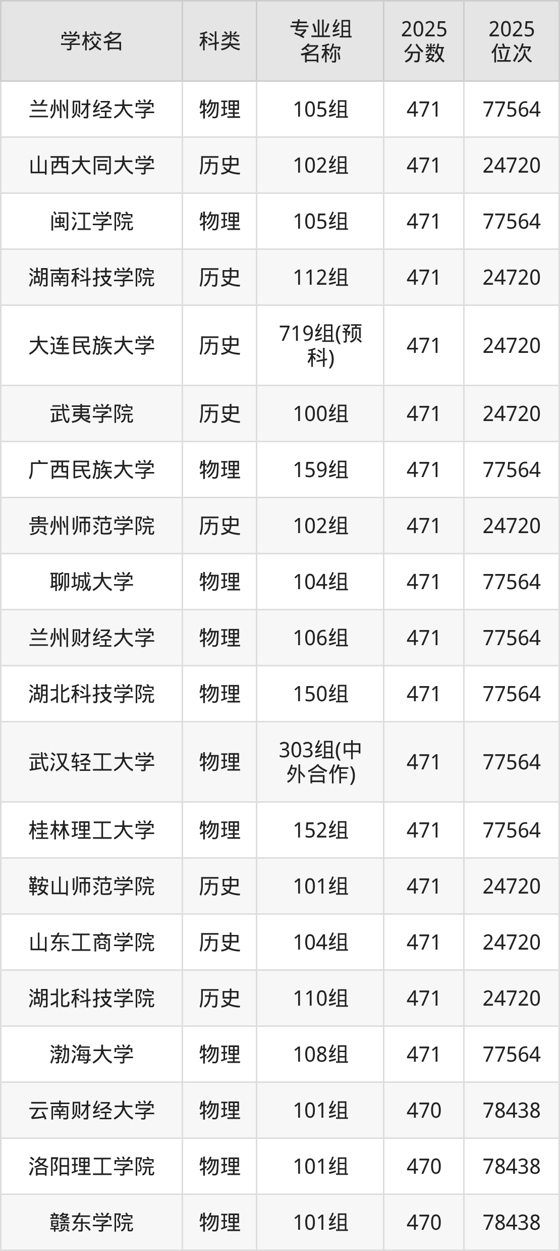以广西物理类为例,471分能上的二本大学有长春大学(位次排名99363名)、桂林旅游学院(位次排名124397名)、朝阳师范学院(位次排名126378名)。