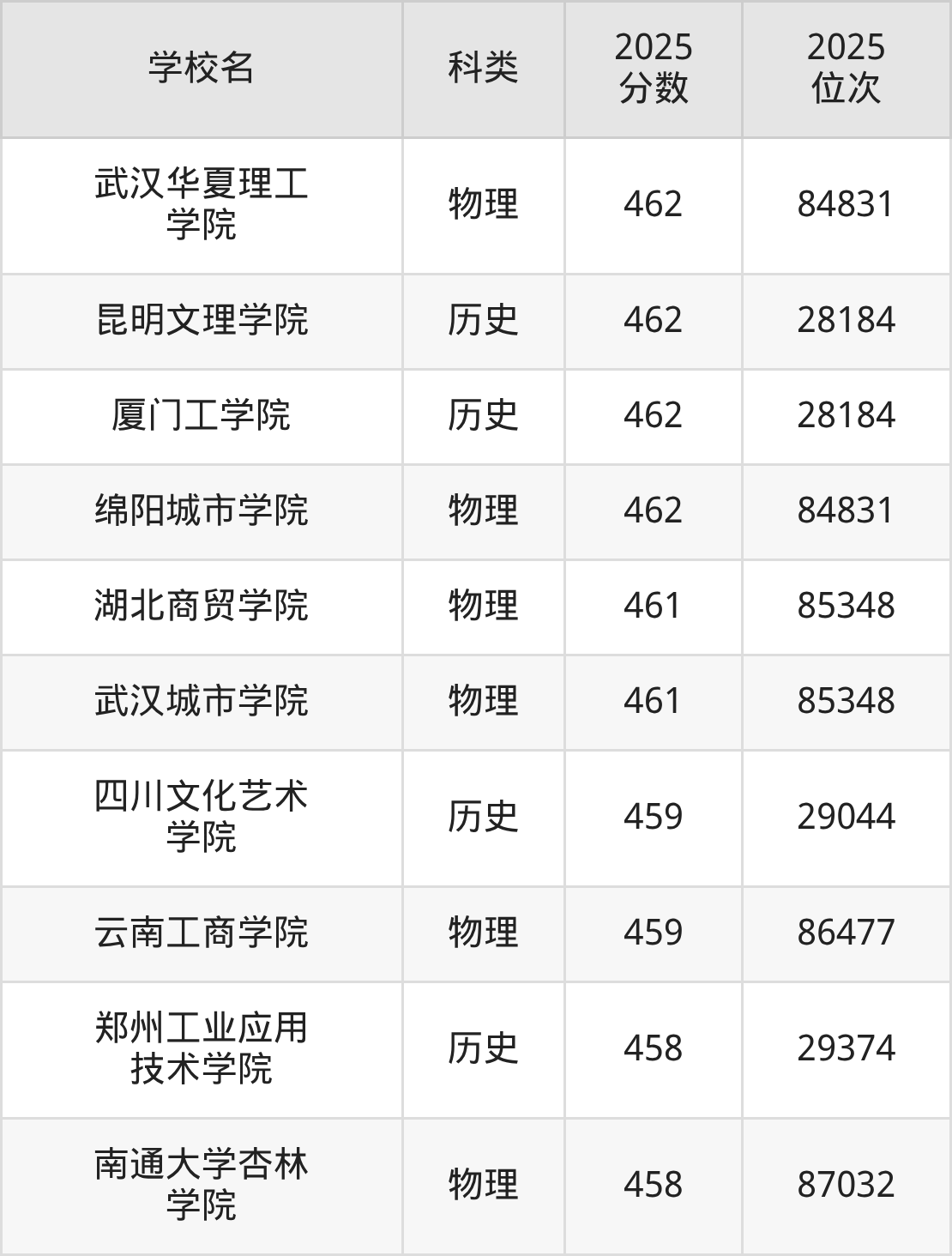 而民办大学录取位次排名最低的是西安培华学院(402分),其2025最低位次为53085名。