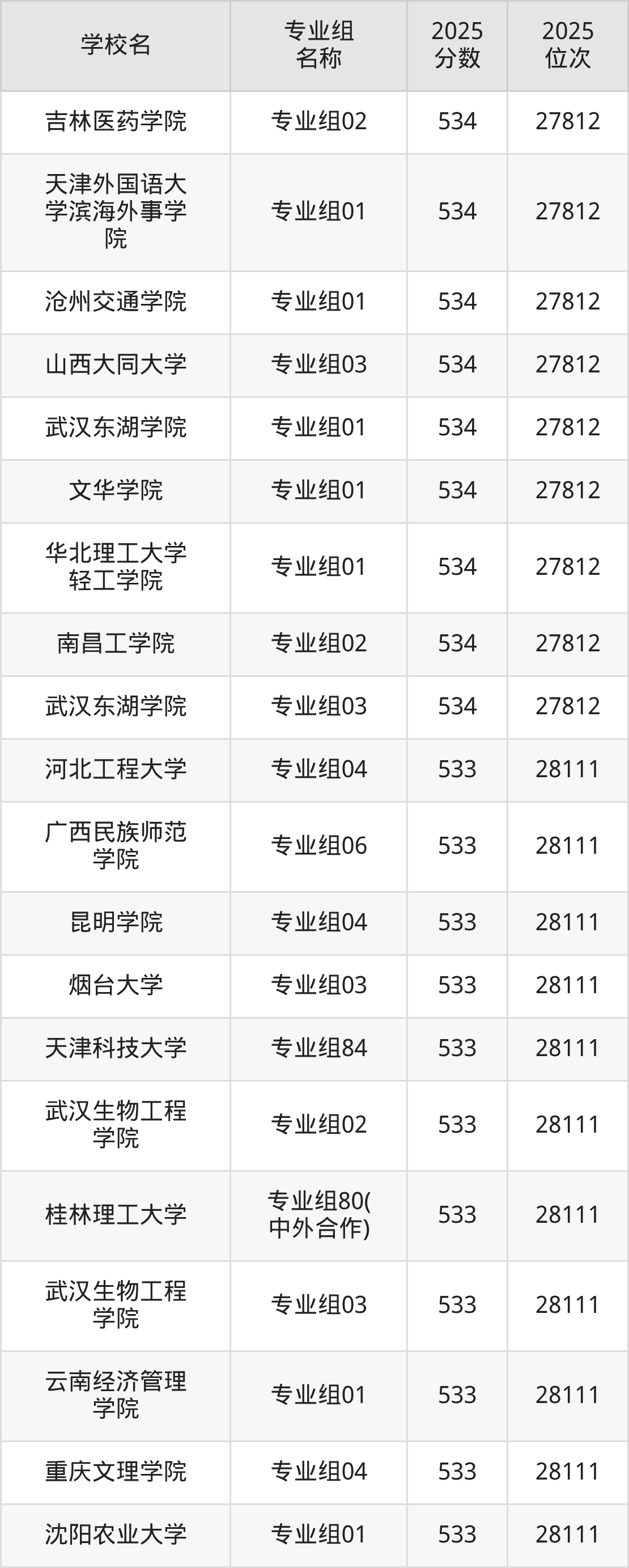 同分数公办本科大学还有呼伦贝尔学院(位次26916名)、内蒙古财经大学(位次26916名)、辽宁中医药大学(位次26916名)等,适合省排名在2.6万名开外的本科生报考。