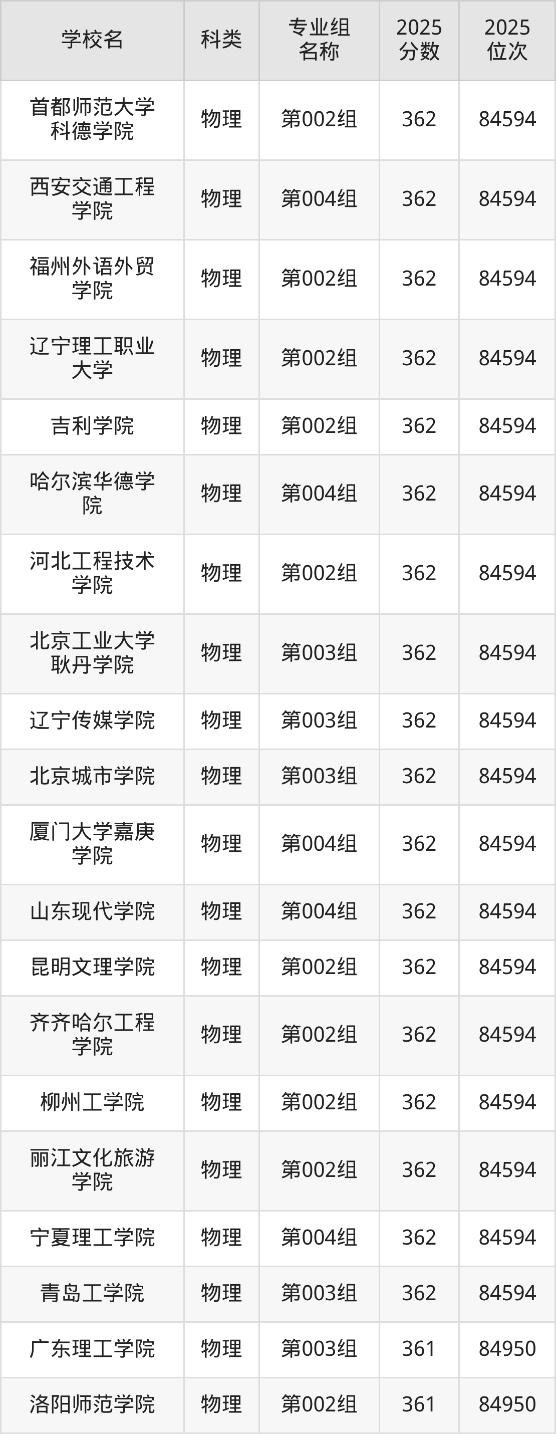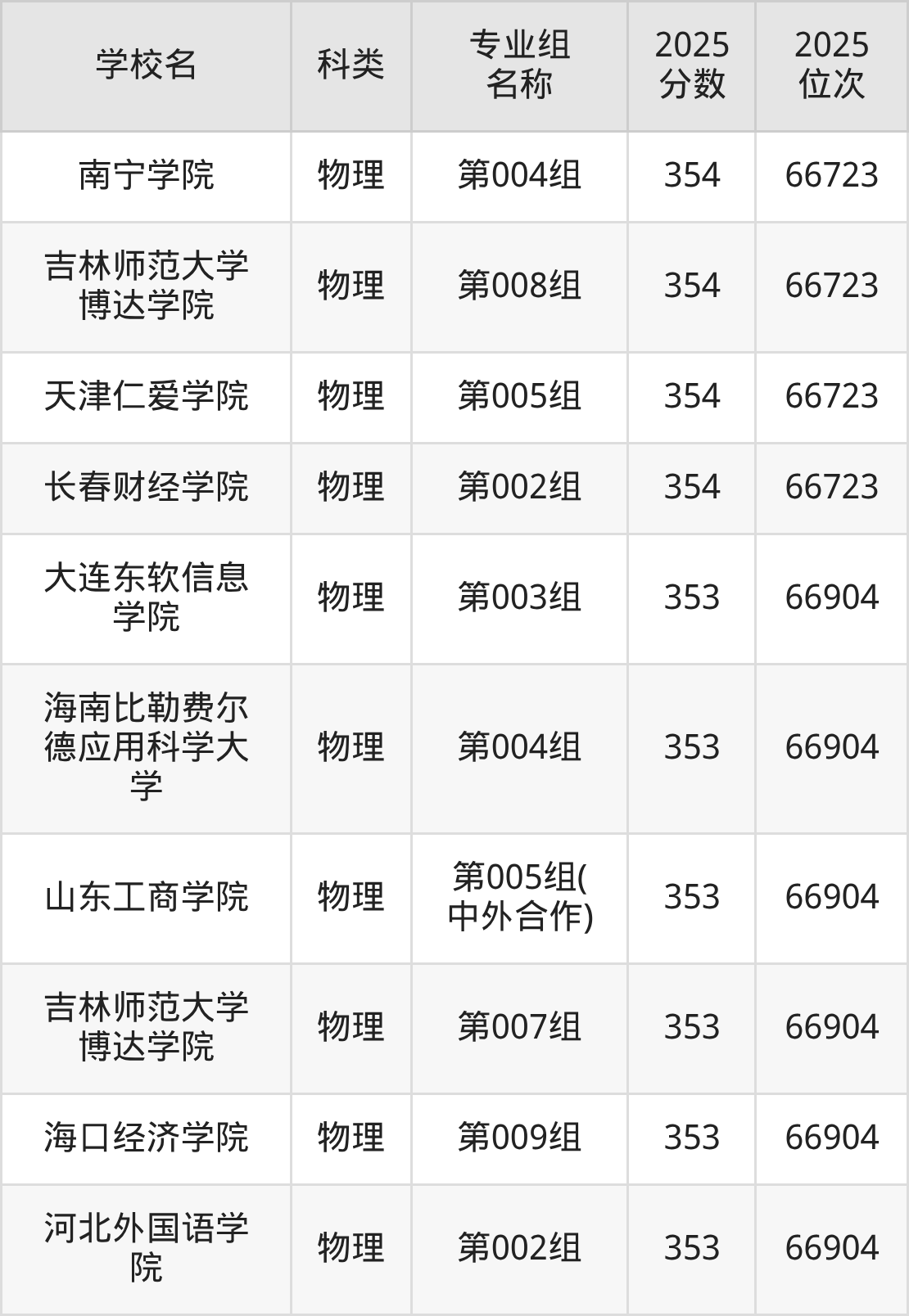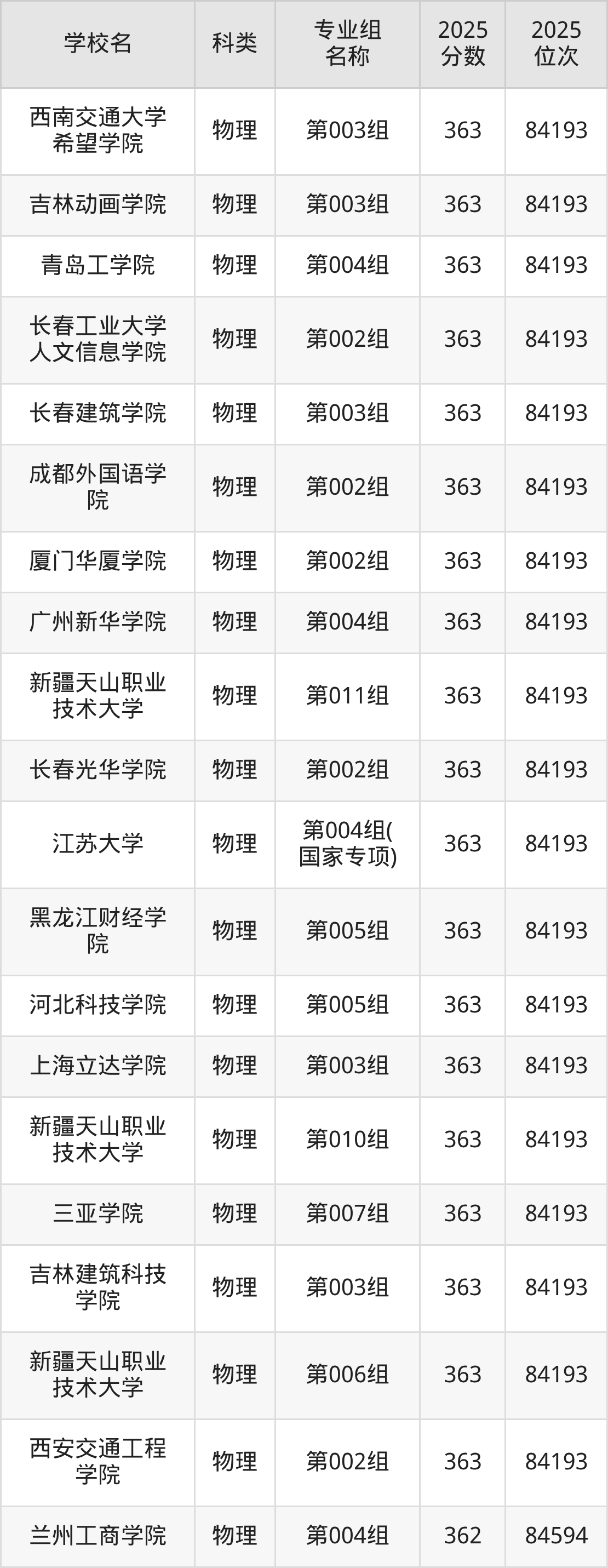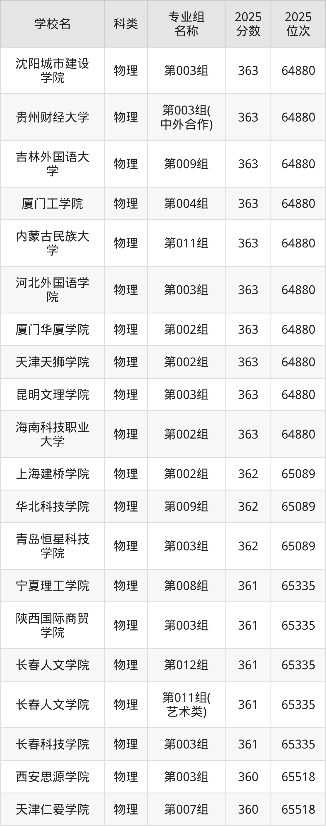 2025年吉林物理类本科线为340分,363分能上的本科大学共计65所,其中公办大学录取位次排名最低的是聊城大学(第004组(中外合作)340分),其2025最低位次为69405名。