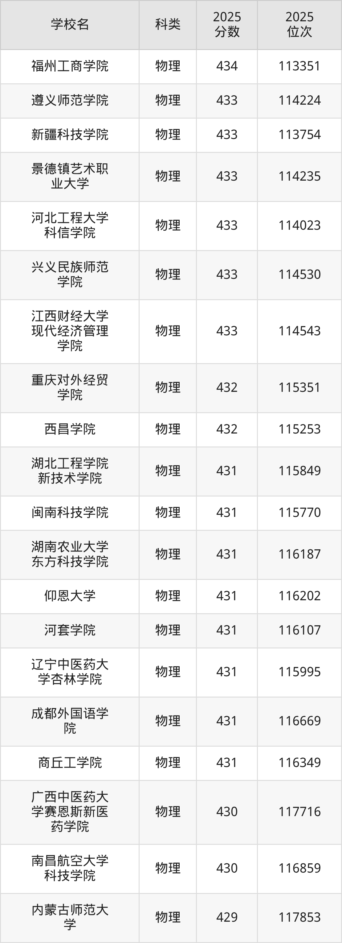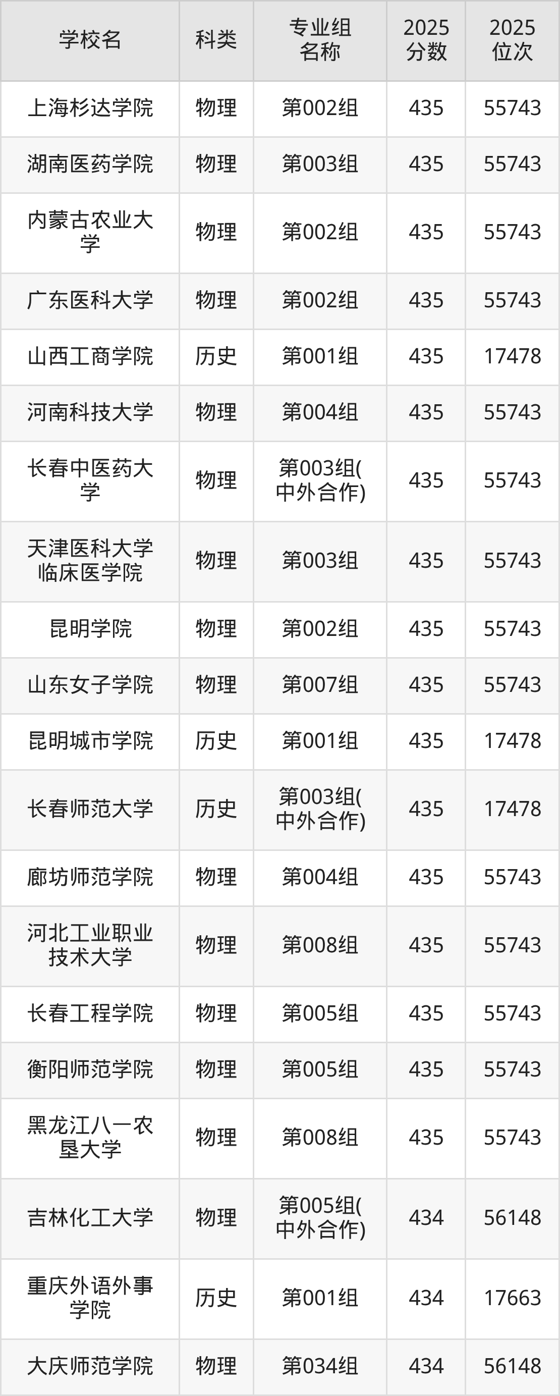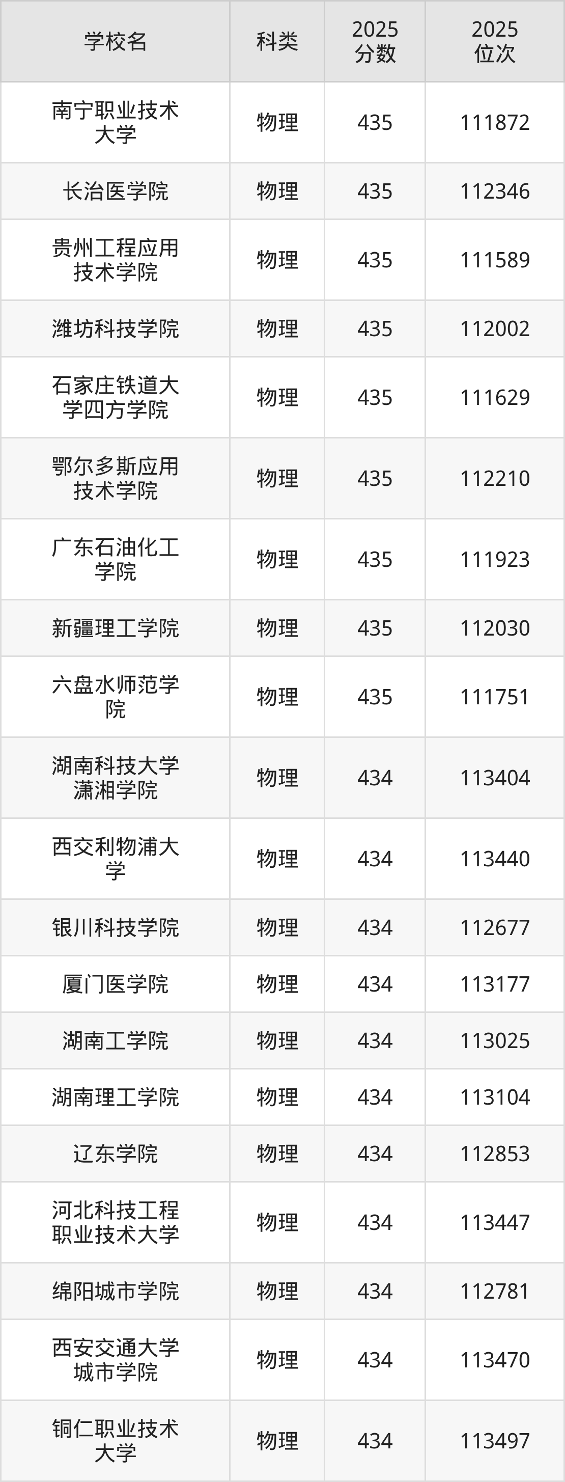 以贵州物理类为例,435分能上的本科大学有广西外国语学院(位次排名156339名)、黑龙江外国语学院(位次排名157914名)、铜仁职业技术大学(位次排名113497名)。