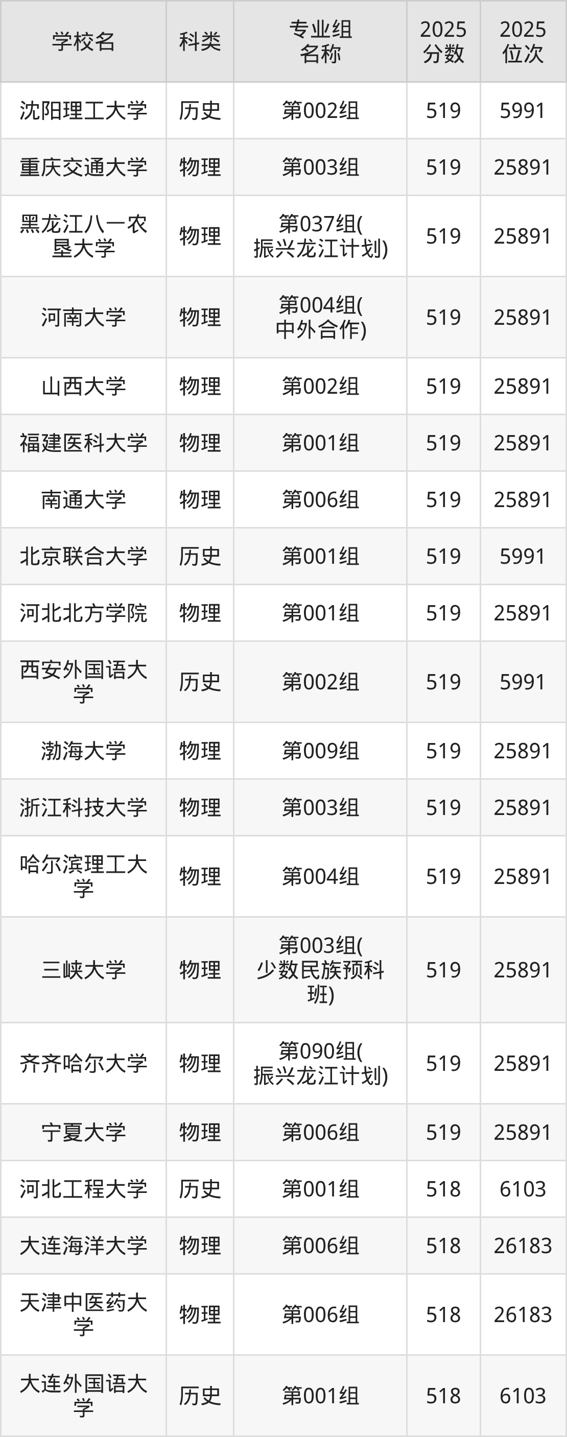 2025年黑龙江物理类本科线为360分,519分能上的本科大学共计772所,其中公办大学录取位次排名最低的是桂林旅游学院(第006组(中外合作)360分),其2025最低位次为85313名。