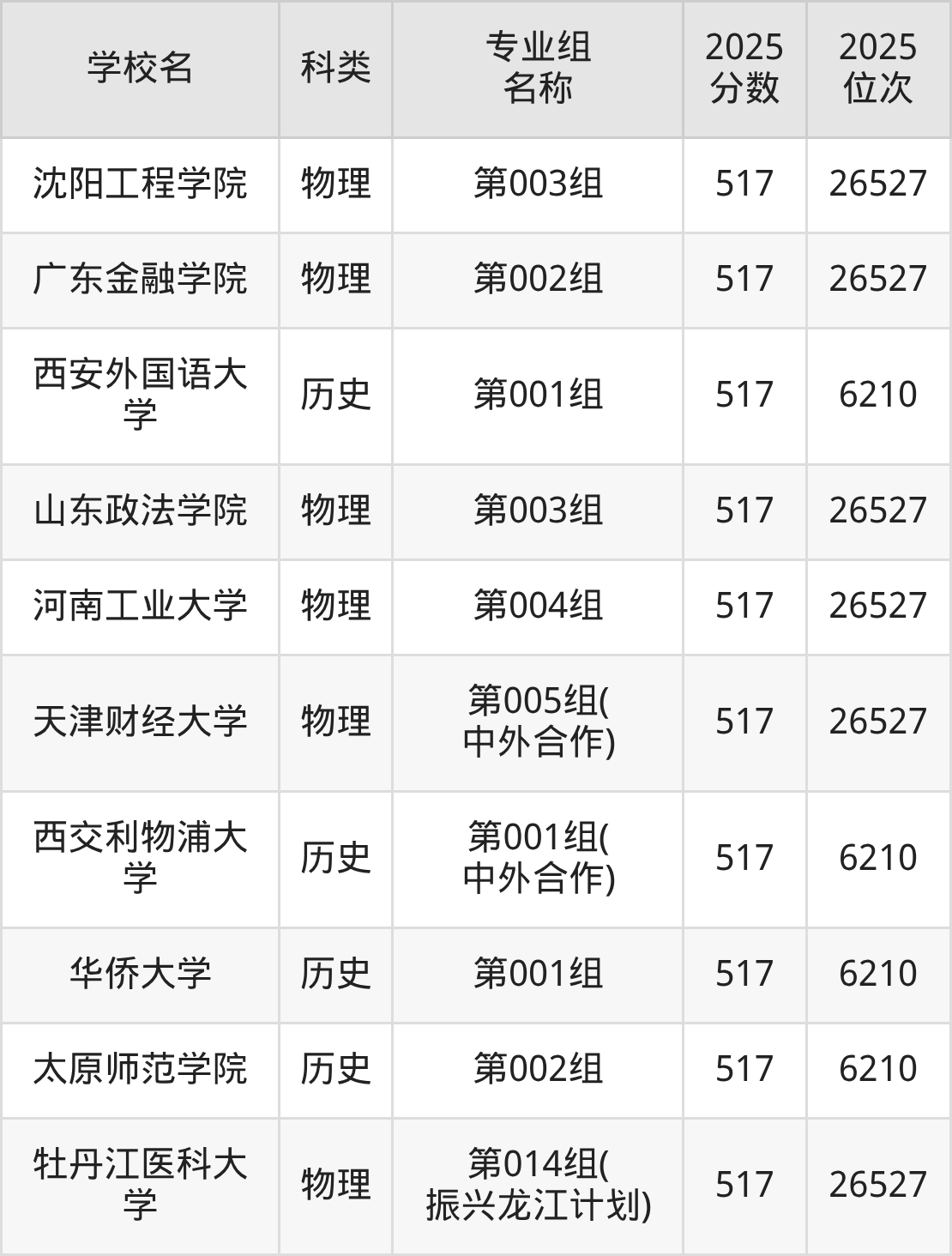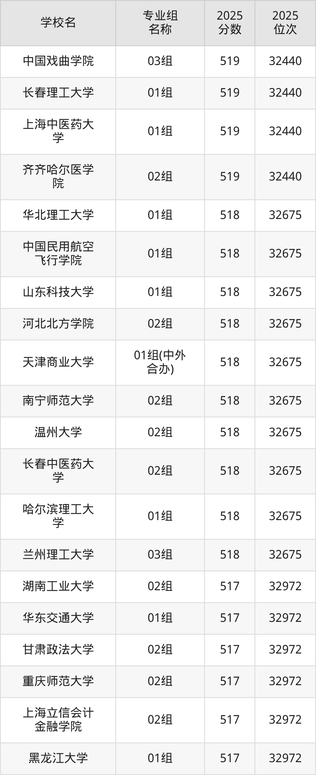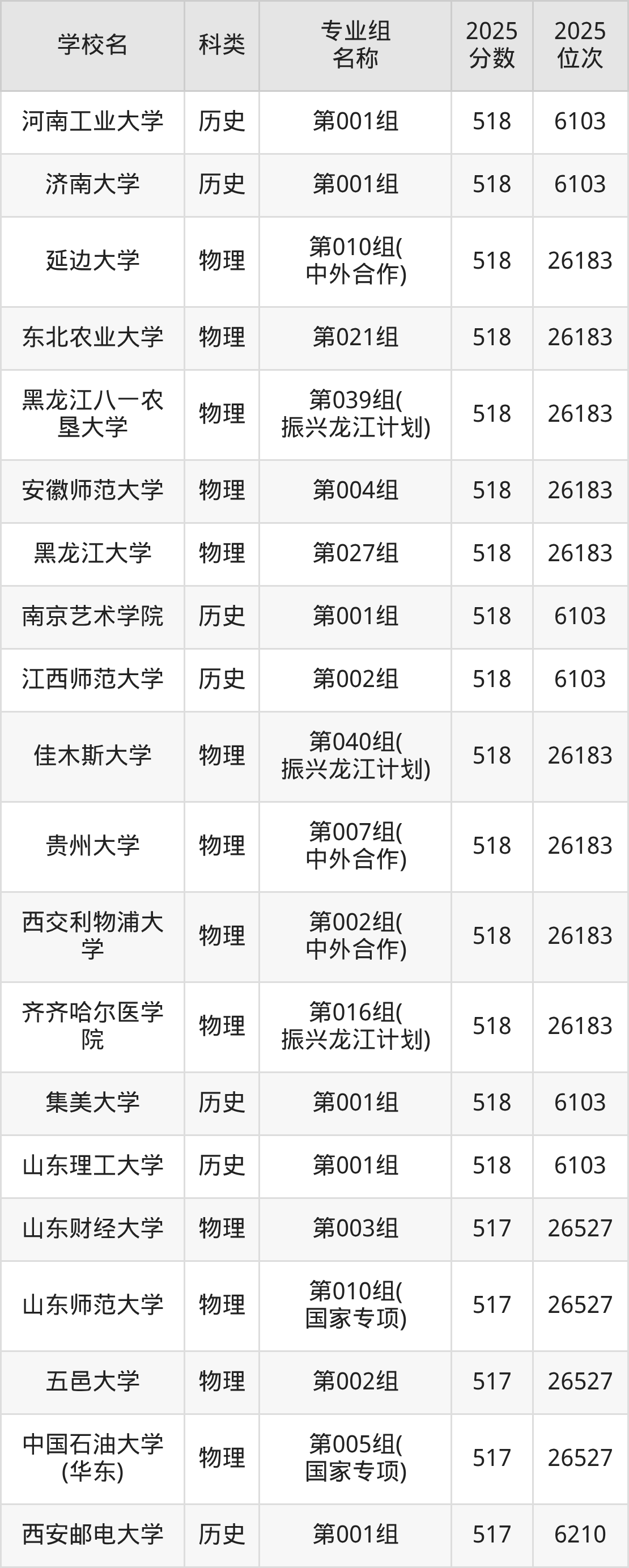 2025年黑龙江历史类本科线为405分,519分能上的本科大学共计552所,其中公办大学录取位次排名最低的是桂林旅游学院(第001组(中外合作)405分),其2025最低位次为22977名。
