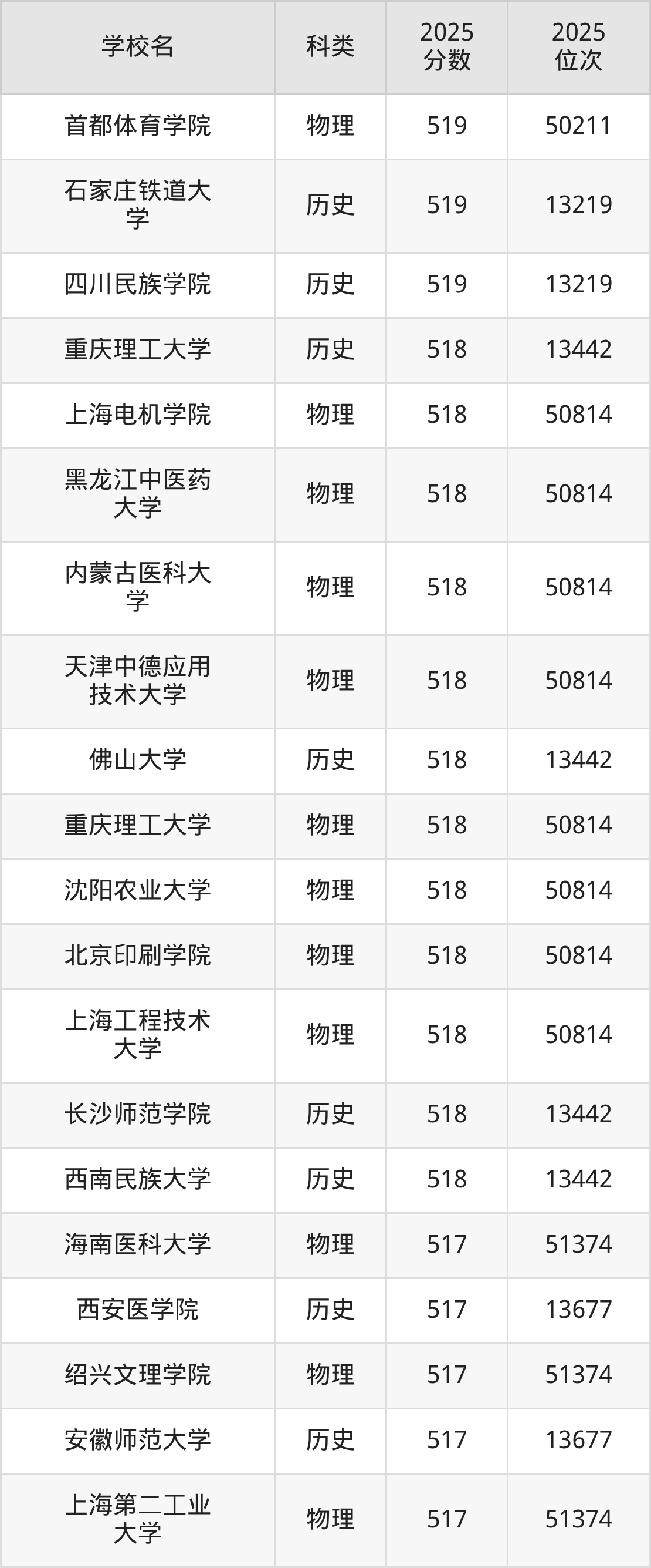 三、北京519分能上的本科大学排名表