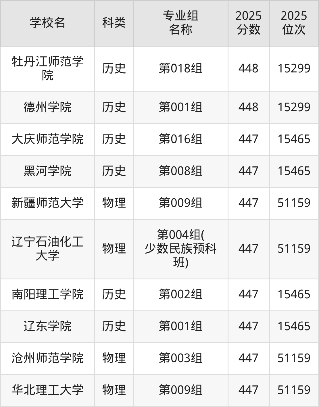 以黑龙江历史类为例,449分能上的本科大学有河北石油职业技术大学(位次排名15943名)、大庆师范学院(位次排名15465名)、黑龙江外国语学院(位次排名20367名)。
