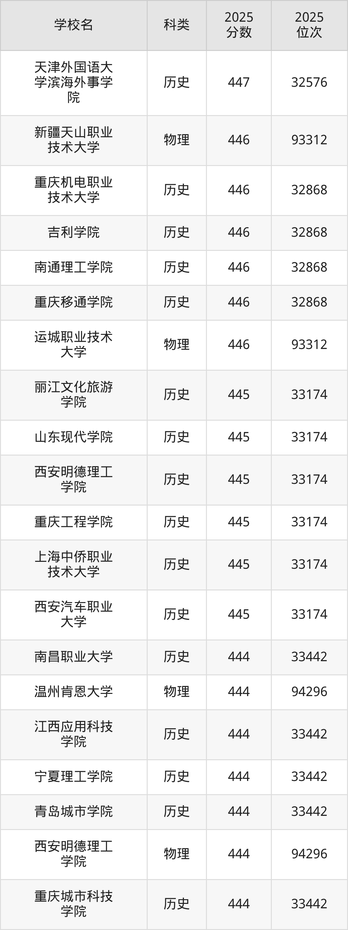 而民办大学录取位次排名最低的是保定理工学院(405分),其2025最低位次为22977名。