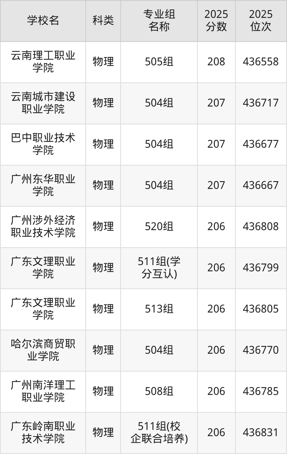 2025年广东物理类专科线为200分,232分能上的专科学校共计40所,其中公办大学录取位次排名最低的是漯河医学高等专科学校(502组208分),其2025最低位次为436597名。